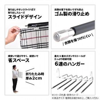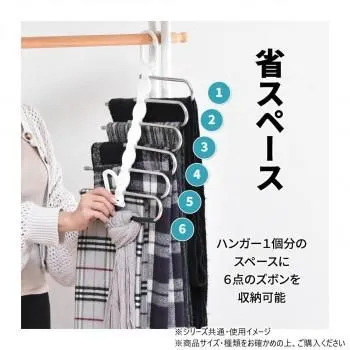 省スペースで6本のズボンが収納できる画期的なズボンハンガーです。折りたたんで使用すれば、6本のズボンが1本のハンガーにつるせる省スペースで利用できて、開いて使用すれば1本1本のバーにズボンがつられているので見やすいです。