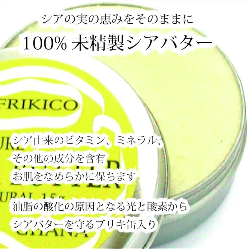 【商品説明】 ガーナ北部タマレでシアの実から伝統的な手作業によって丁寧に作られた未精製シアバター100%。シアの実由来のビタミン、ミネラル、その他の成分もそのままに。遮光性、酸素バリアー性に優れたブリキ缶入。日本の製造工場で丁寧に容器詰めしています。
