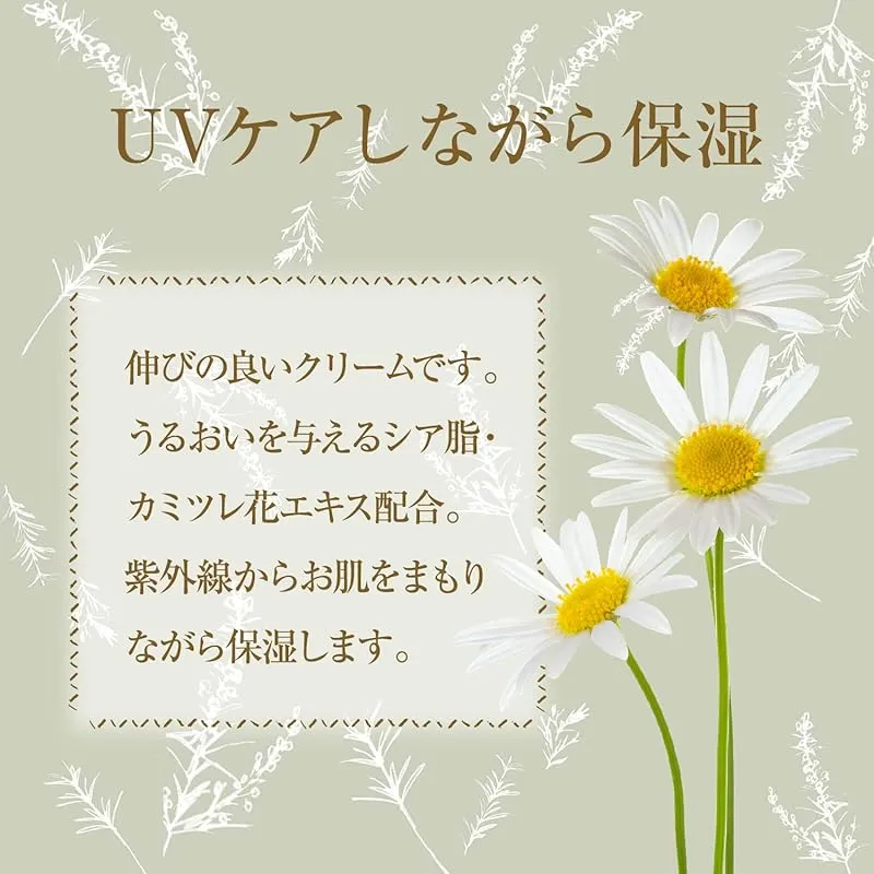 【100%自然由来成分】紫外線吸収剤、 合成界面活性剤を使わず、 石けんで乳化したシンプルなクリームです。伸びが良くうるおいを与えるシア脂・カミツレ花エキス配合。紫外線からお肌を守りながら保湿します。 ?