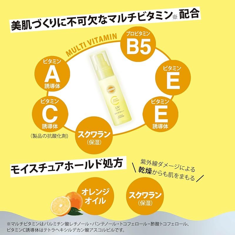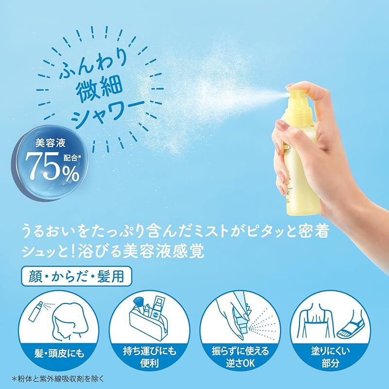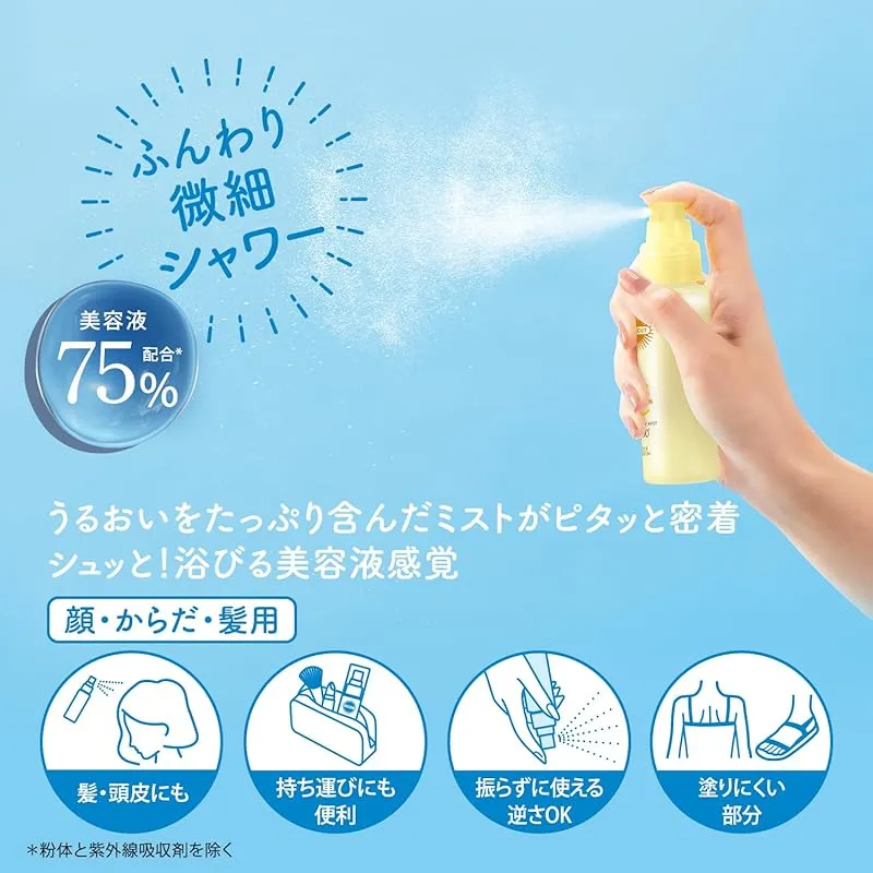 【商品概要】 未来の美肌を変える、シミ・肌あれ予防UV。肌あれ、日焼けによるシミ・ソバカスを防ぎ透明感あふれる素肌を引き出します。 毎日降り注ぐ協力紫外線から素肌を守り抜く。肌荒れ・シミ・ソバカスの原因となるUV-Bや肌内部のメラニン色素を黒くしながら、真皮まで侵入し、ハリ・弾力感を失わせるUV-Aからもブロック。肌に悪影響を及ぼす太陽光からしっかりガードします。 美容液75%配合。素肌と一体化したようなつけ心地。 いつでも塗りなおせるミストタイプ。顔・からだだけでなく髪の毛にも使えます。 アレルガード機能付きで、花粉・ほこり・PM2.5などの微粒子もブロック。