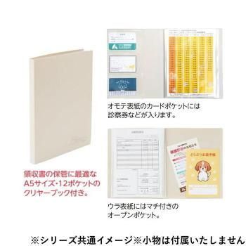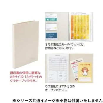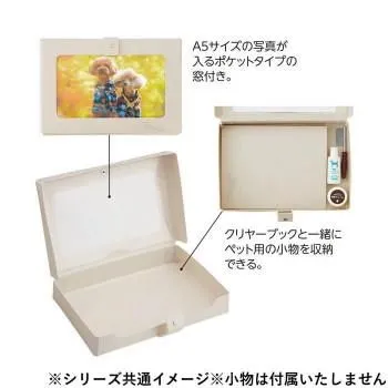 ペットに関する書類とお薬や小物などの収納にぴったりな整理ケース。A5サイズの写真が入るポケットタイプの窓付きケース。領収書の保管に最適なA5サイズ・12ポケットのクリヤーブック付き。クリヤーブックにはペットのプロフィールや健康状態を記録できる用紙と、年齢換算表が付属しています。クリヤーブックには診察券等のカードが3枚入るポケット付き。