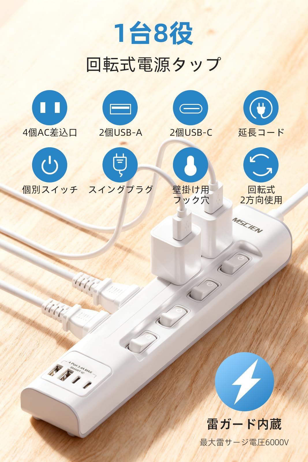 新着商品 Mscien 電源タップ 回転 延長コード 2m コンセント 向き変換 ローリングタップ 向きを変える たこあしコンセント 回転式 usb テーブルタップ 4個AC口2個USB-A 2個USB-C 個別スイッチ スイングプラグ 壁掛け 雷ガード エム