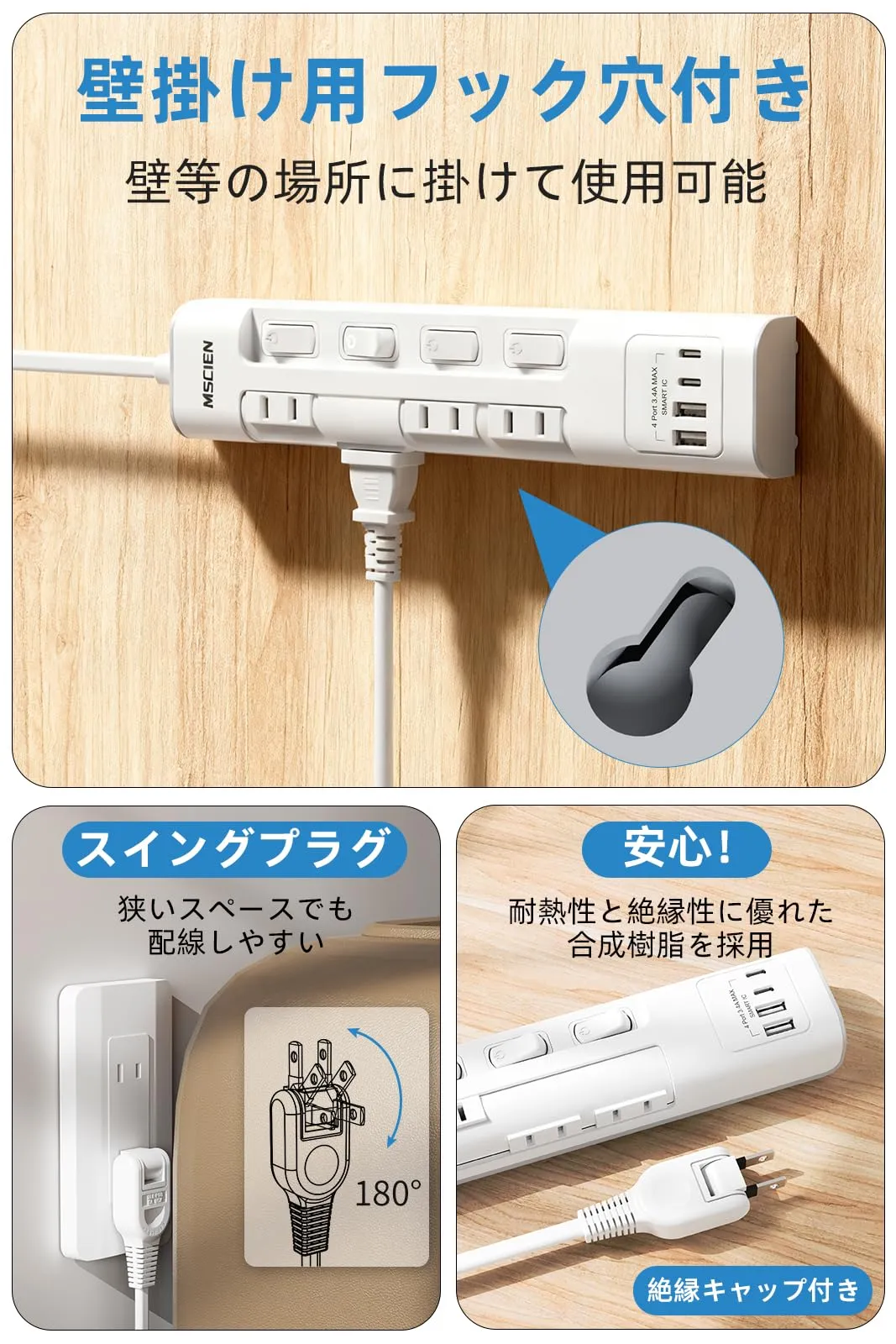 【180° スイングプラグ+壁掛け穴、狭い場所にも対応】:スイングプラグは180°回転できるので、壁際・隙間・家具の後ろなど狭いスペースでも配線しやすいです。延長コードを採用し、コンセントから離れた場所で使えます。壁掛け用フック穴があり、壁、デスク下やキャビネットの側面などに掛けて設置可能。壁掛け対応でスペースを節約してすっきり設置できます。