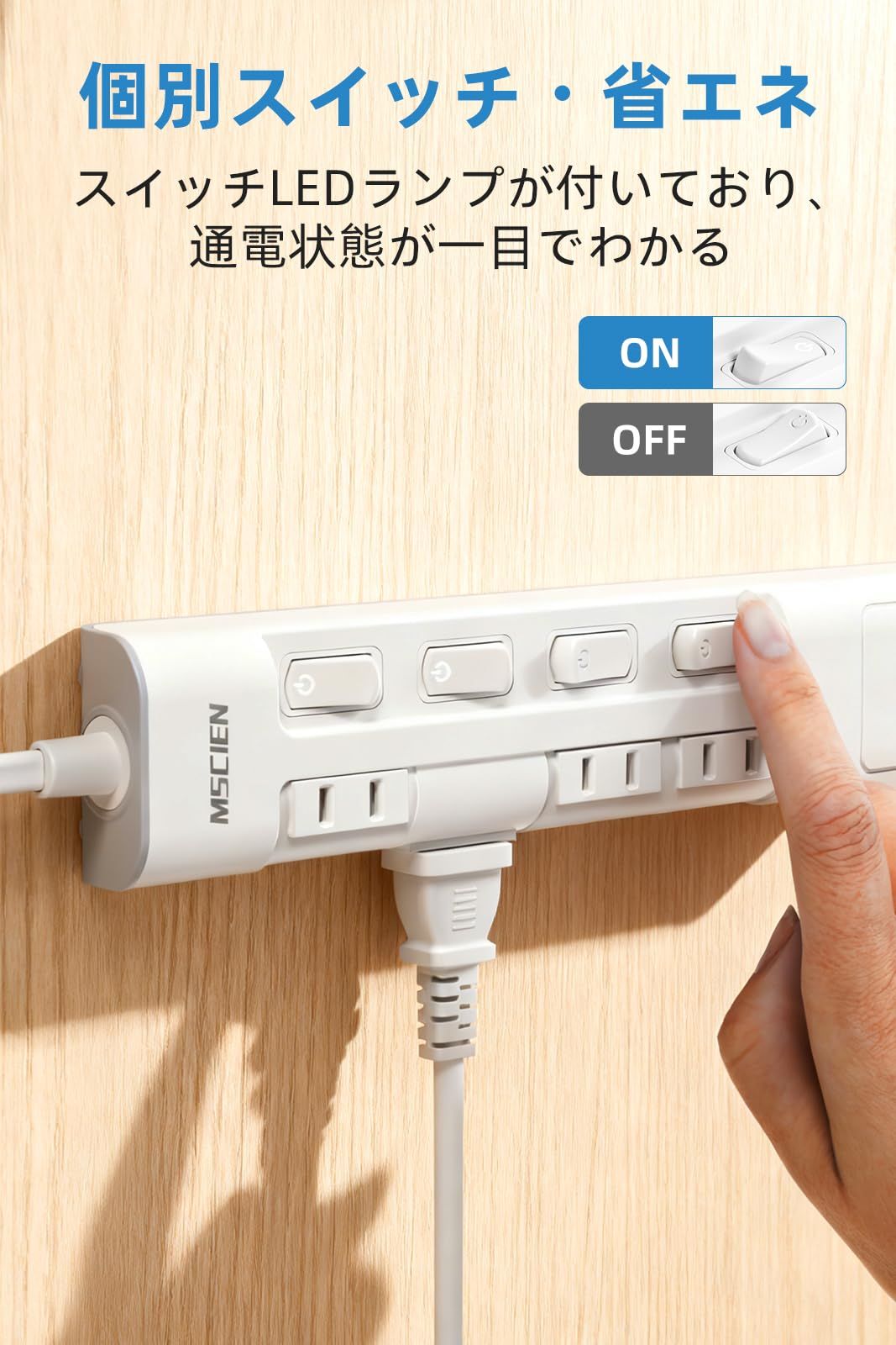 【個別スイッチ付き・節電・省エネ】:各ACコンセントの個別スイッチで、接続した機器の電源を個別にオン/オフ可能。使用しない機器の電源を切り、待機電力の節約に効果的です。スイッチLEDランプが付いており、通電状態が一目でわかって便利です。夜間でも簡単に操作でき、電源管理が楽になります。
