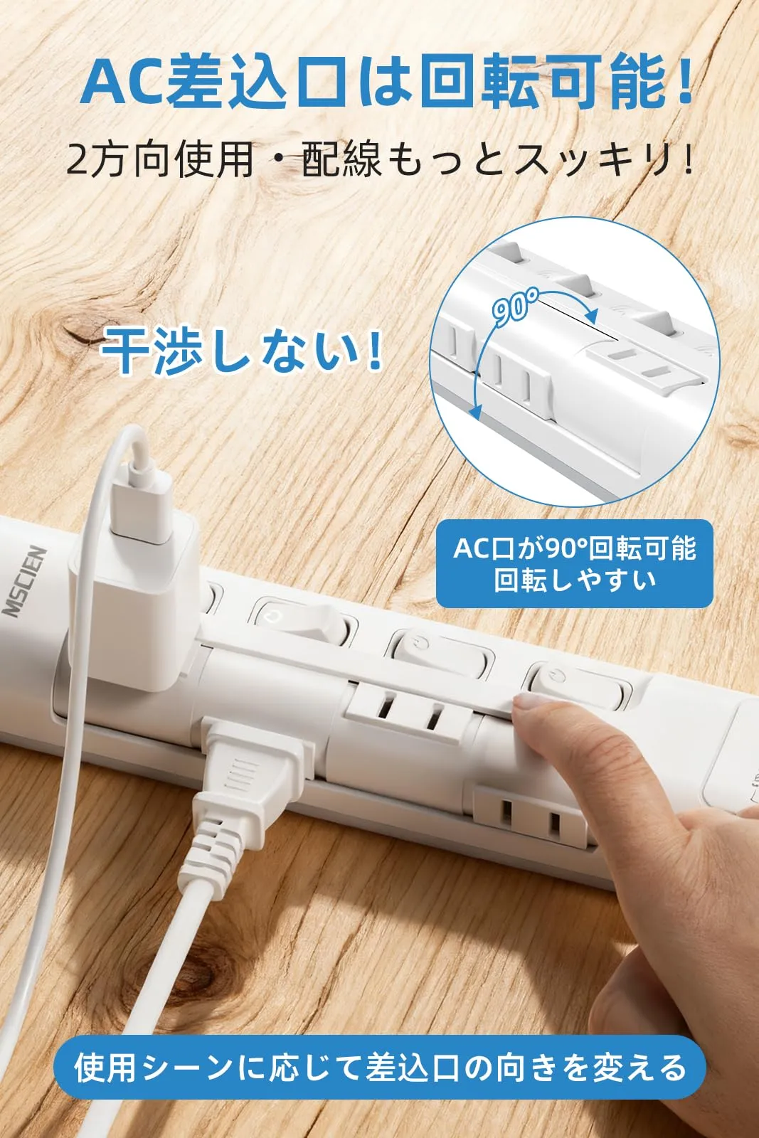 【回転式 AC 口でアダプター干渉ゼロ!配線整理スッキリ~】:電源タップは、AC差込口が90°回転可能、2方向使用で配線もっとスッキリです。AC口を回転させることで、アダプターが互いに干渉せず、利用率が大幅に向上します。使用シーンに応じて差込口の向きを変え、接続機器の方向に合わせて正面または側面のAC口に差し込み、両方向で自由に使用できて非常に便利です。※ご注意:回転してから差し込み、差し込んだ後は回転できないです。使用可能な方向は2方向に限ります。