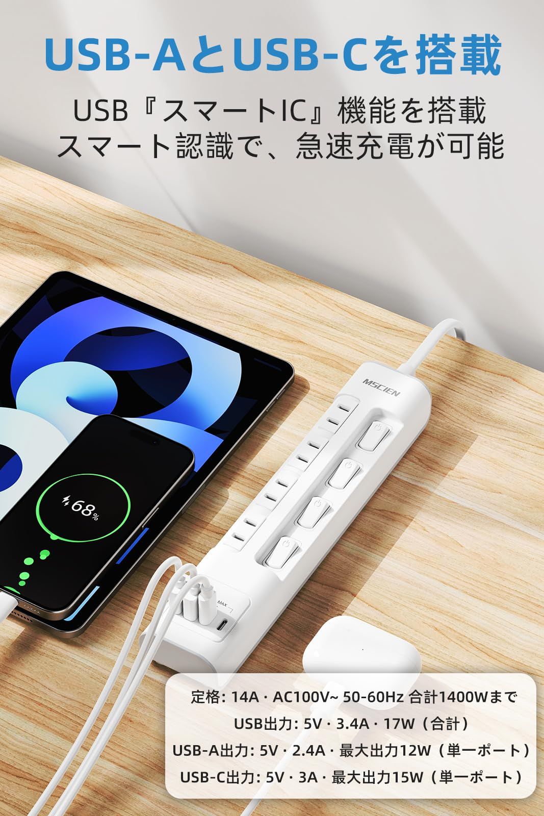 【1台8役・USBC×2+USBA×2 搭載、充電器レスでスッキリ】:2つのUSB-Cポート、2つのUSB-Aポートと4つのAC差込口を搭載したマルチタップ。USB-AとUSB-Cの両方を搭載しているため、使用範囲が拡大し、使いやすい。USB『スマートIC』機能を搭載しており、スマート認識で、スマホ・タブレット・イヤホンなど多機種に対応可能。卓上の充電器を削減し、スペースを節約。USB 合計出力 5V/3.4A、日常の充電に最適です。