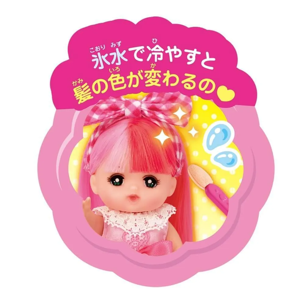 手のひらサイズで、いつでもどこでもつれて遊べるポケットメルちゃんシリーズ。メルちゃんは氷水で冷やすと髪の色がピンクから濃いピンクに変化するよ。手で温めると元の色に戻ります。