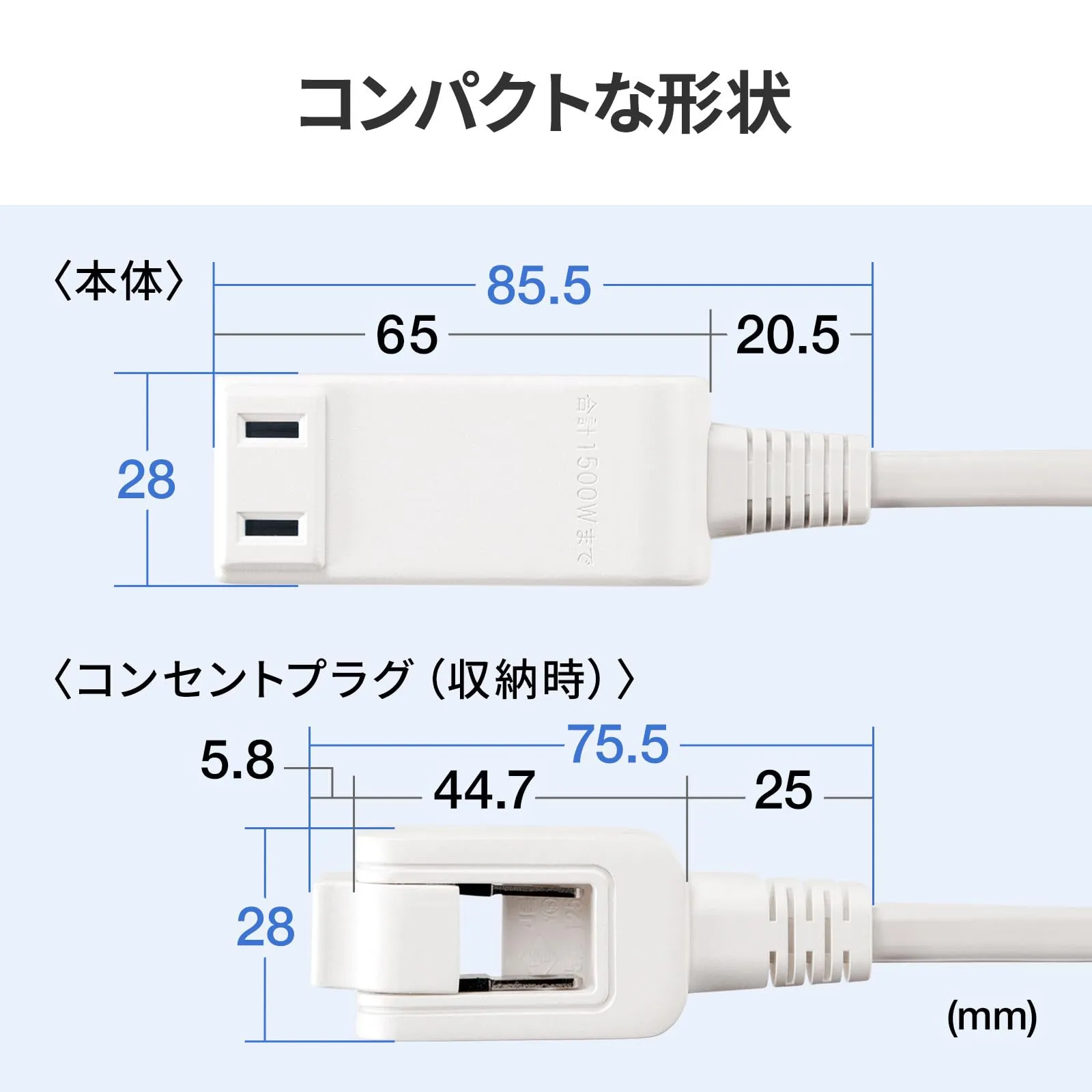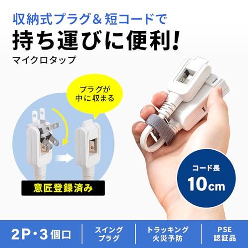 ●ケーブル長は10cmと短く、持ち運びに便利なモバイル用タップです。