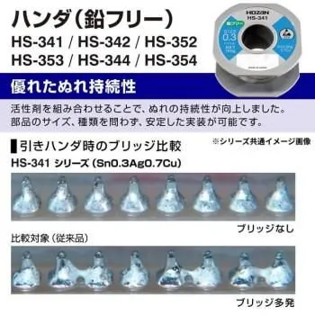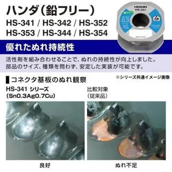 鉛フリーハンダ。ぬれ性を重視したフラックスを採用し、作業性の低下は最小限にとどめています。Sn-3Ag-0.5Cuのハンダから切替えた場合でも設備の新規導入や作業方法の大幅な変更は不要です。