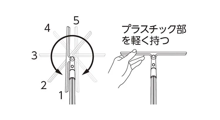 【ワイパーの角度の変え方】ワイパーは上図のように角度を変えることができます。ワイパーのプラスチック部を軽く持って動かしてください。
