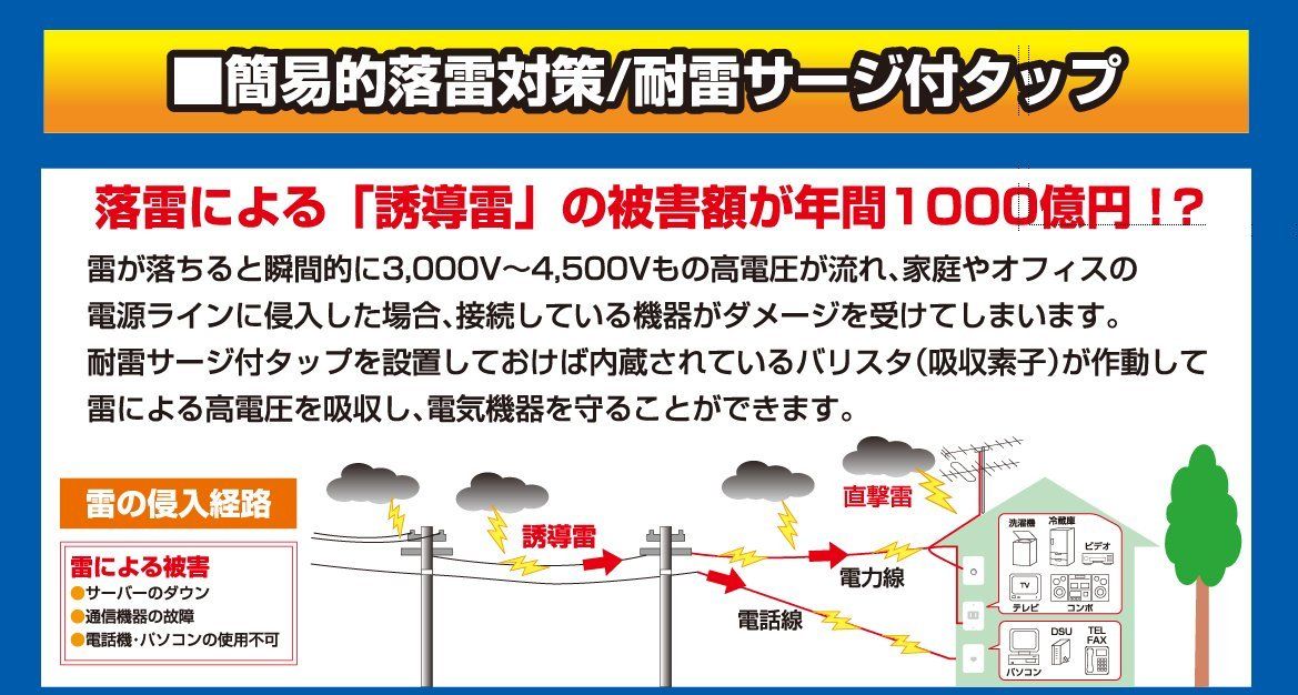 【電源ラインサージ低減】内蔵されたサージ低減素子(バリスタ)が雷および開閉サージを低減し接続された機器を守ります。