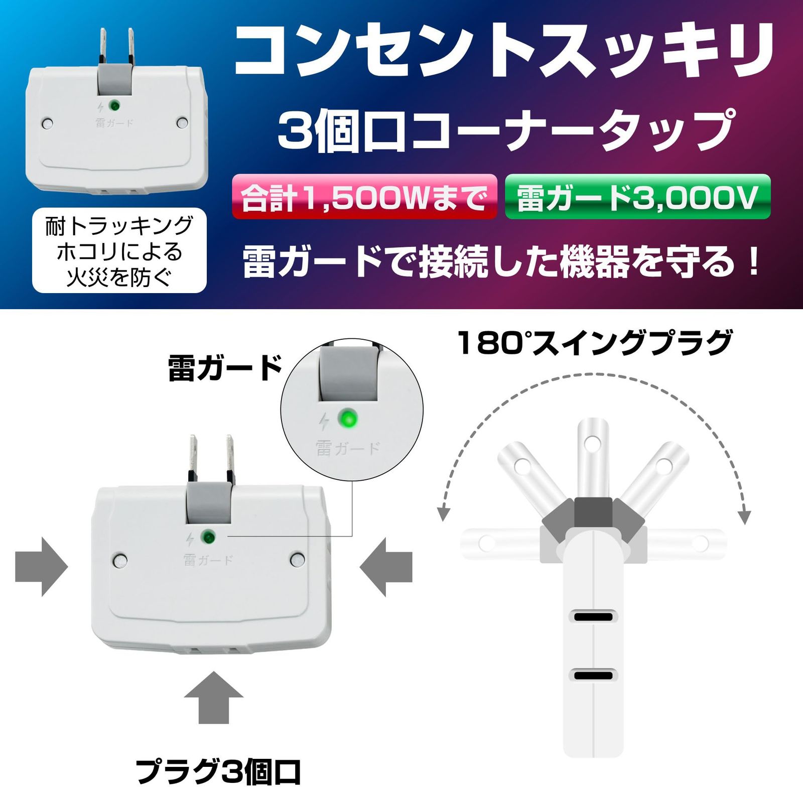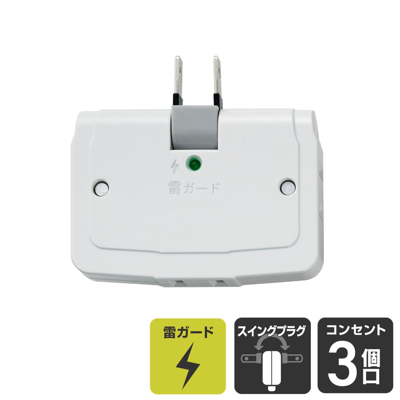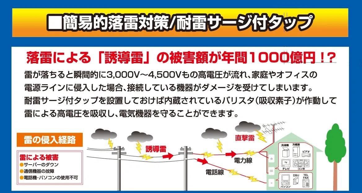 【雷に強い】1つのコンセントから3方向に電源を分配することができます。耐雷サージ機能付トリプルタップです。