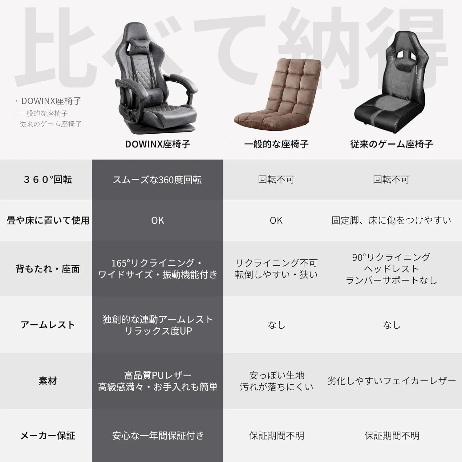 【機能フル装備】Dowinx独自の連動型アームレストはリクライニングと同時に調整され、どんな角度でも手や肘を完全にサポートします。振動リラクゼーション機能付きの腰当ては腰の負担を軽減し、快適に過ごせます。165°までリクライニング可能で、ほぼベッドのような休息が得られます。360度回転するベースは、テレビ視聴や物の取り扱い、動作の自由度を高めます。