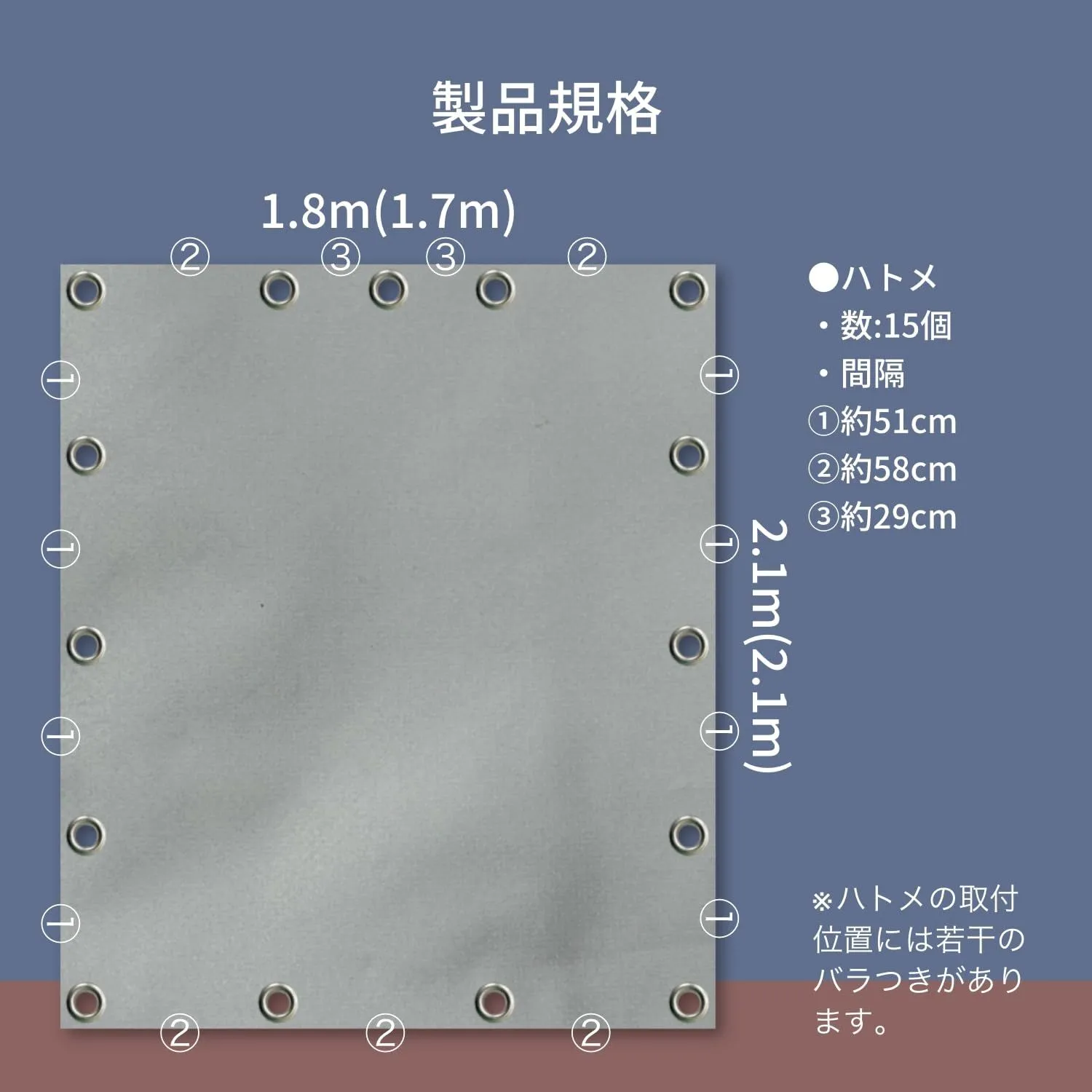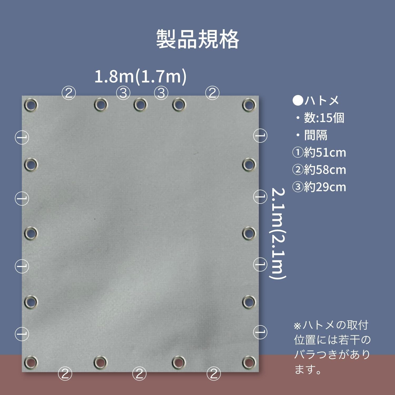 材質 シート:ポリエステル(PVCコーティング)/ハトメ:アルミ(内径:12㎜)の使い分けが可能。