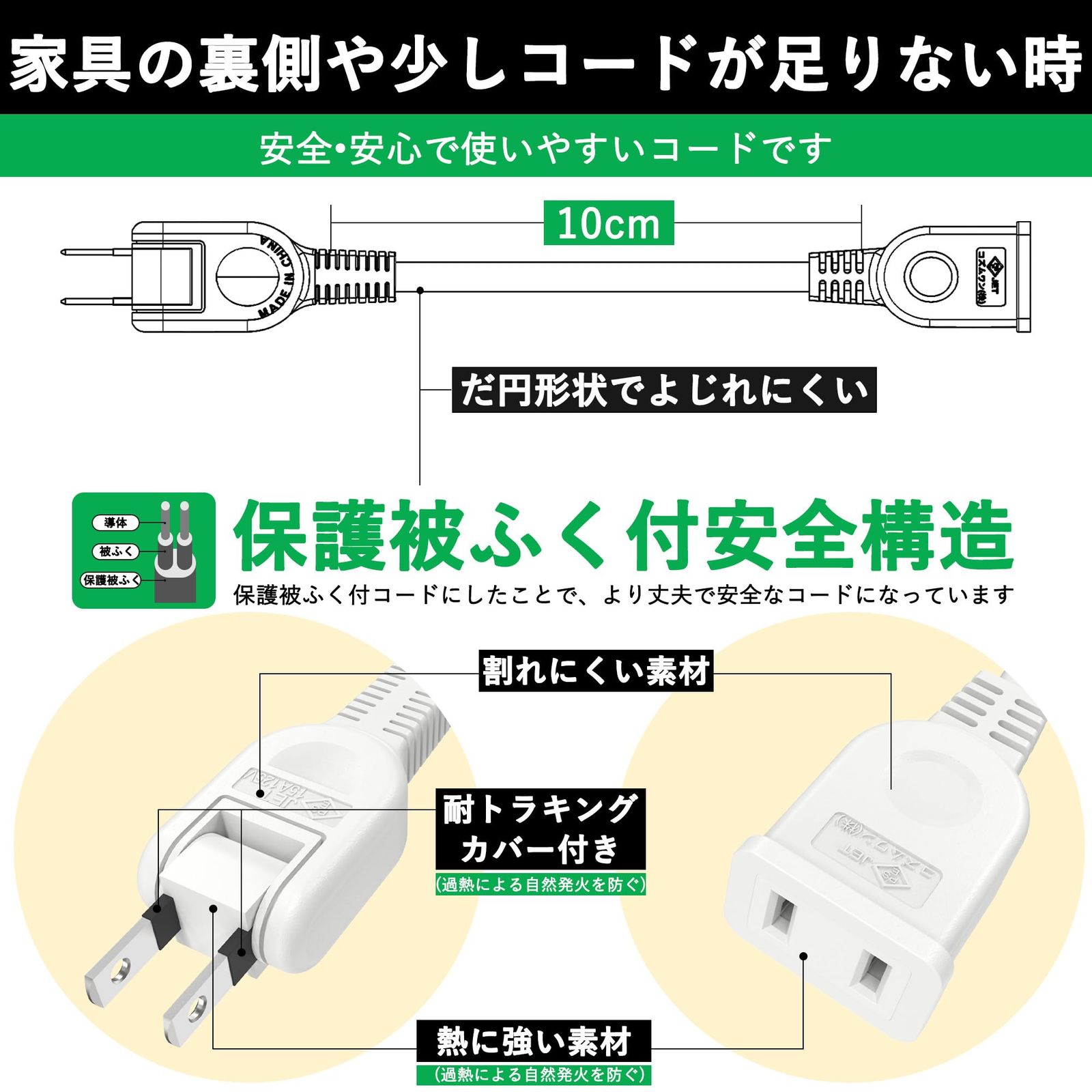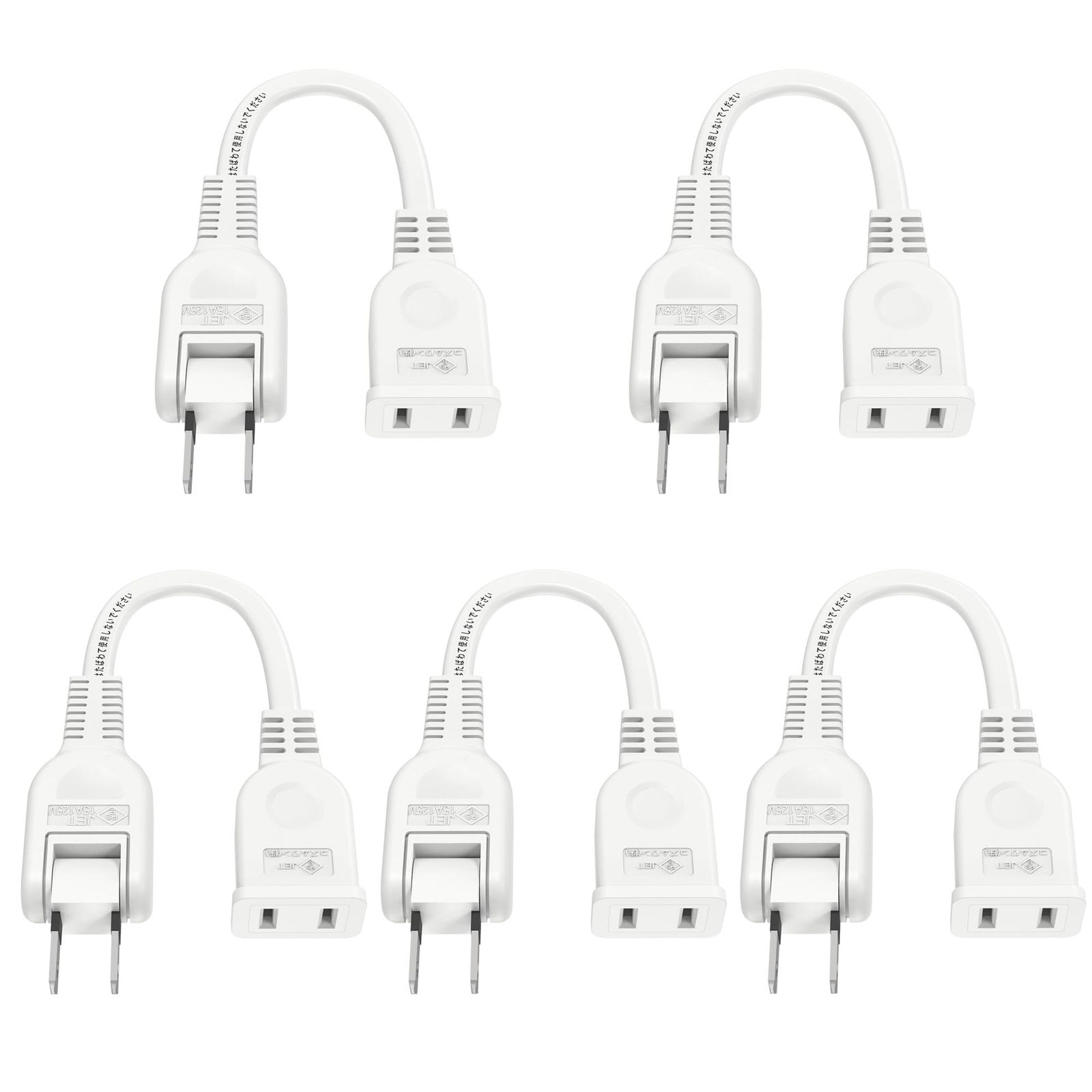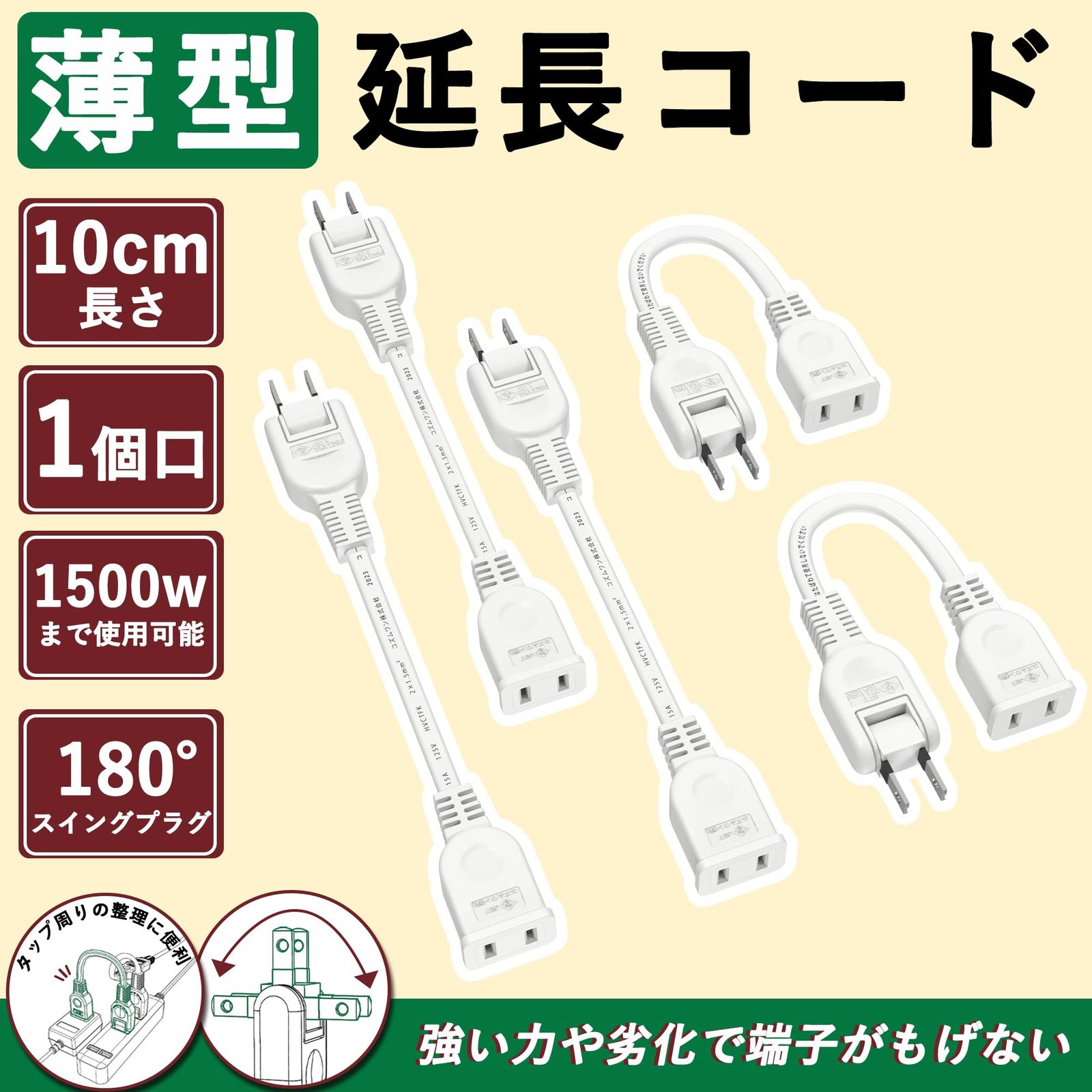 【5本セット】延長コード 10cm 0.1m 電源タップ 1個口 ホワイト ACアダプタ用電源延長コード 15A 1500W すっきり接続 スイングプラグ 短い PSE 2芯 二重被覆 マークあり 絶縁キャップ付き ちょっとコード 電源ケーブル 電源プラグ おしゃれ 作業用 業務用 テーブルタップ (10cm 5本セット ホワイト)