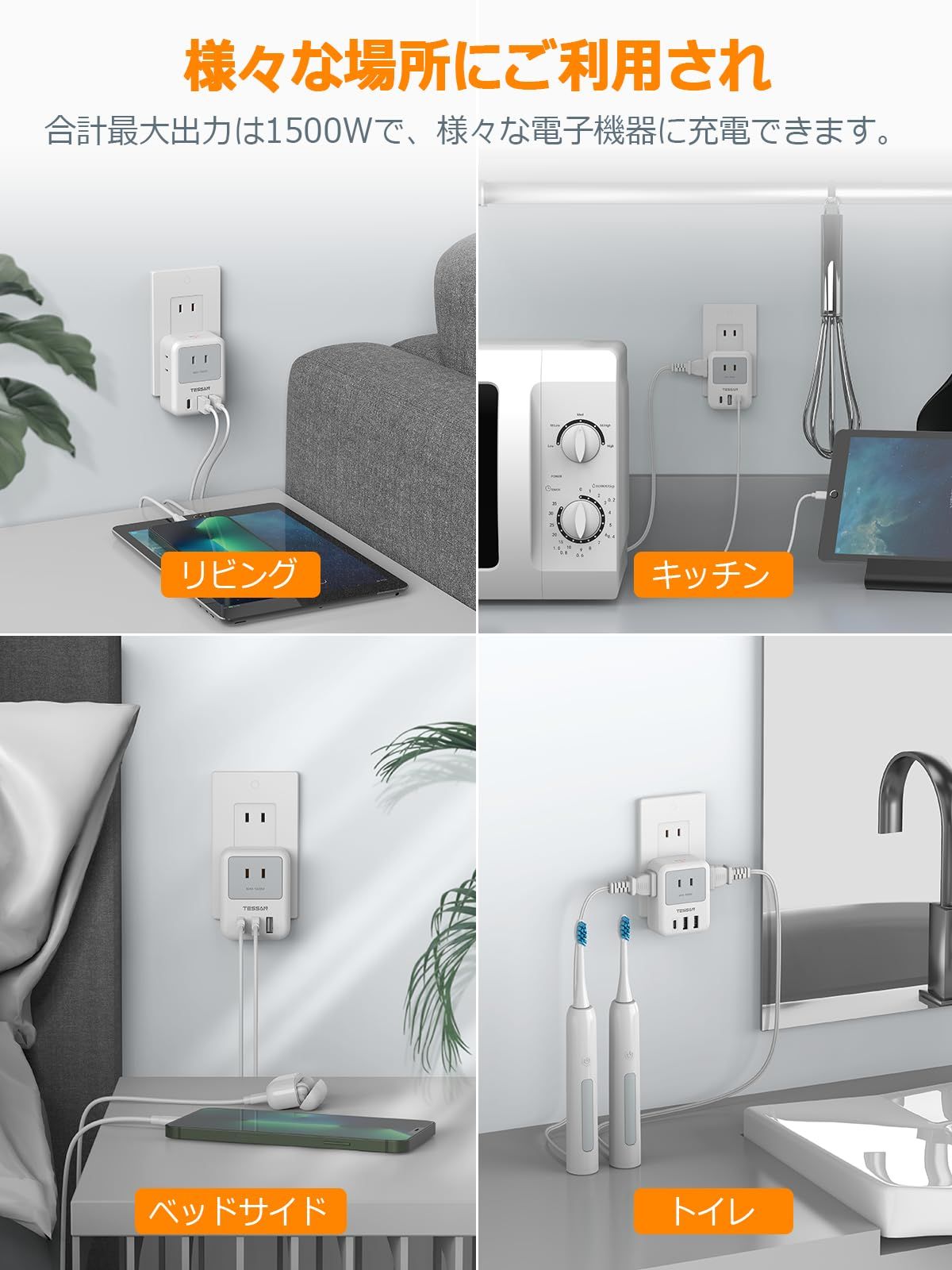 【多場所ご利用され】従来の伝統的なこんせんと たっぷと違って、type-cポート及びtype-aポートが同時搭載している壁直差しタップです。また、1500Wの合計最大出力で、宅内のリビング、キッチン、ベッドサイドやトイレなどの様々な場所にご利用頂けます。違った場所に複数の電子機器に充電したい場合、これ一つの分岐コンセントがあれば、十分です。ご注意:日本国内のみご使用できて、海外での使用は禁止です。 ブランド TESSAN 色 グレー 電源コンセントの総数 3 電圧 125 ボルト 商品の寸法 7.2長さ x 5.5幅 cm 最後までご確認頂き誠にありがとうございました。 ご確認頂き、ご購入いただけましたら幸いです。 何かご不明点などがございましたらお気軽にメッセージからお問い合わせ下さい。