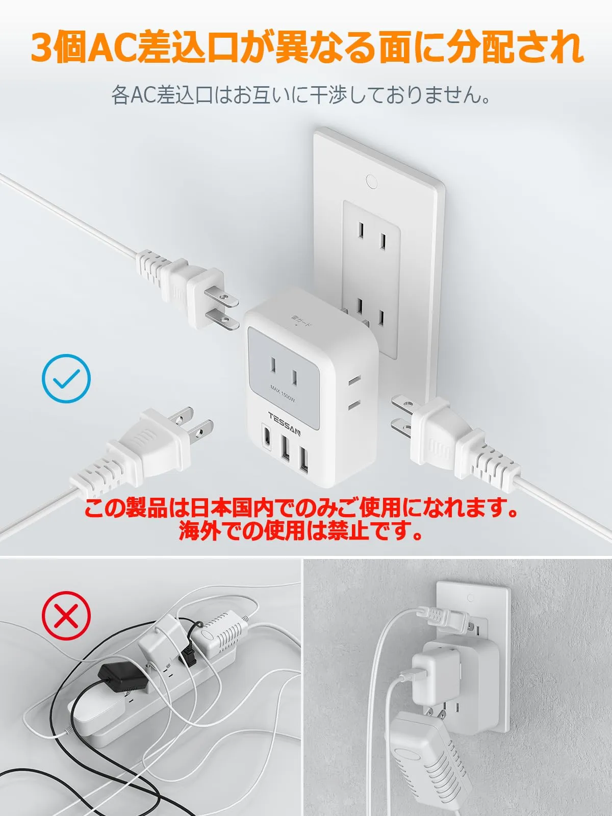 USB コンセント タップ TESSAN 電源タップ USB-C付き 3個AC口 2個Type-A 1個Type-Cポート たこあしコンセント タコ足配線 USB充電器 マルチタップ 雷ガード付 小型軽量 日本国内でのみ使用可能