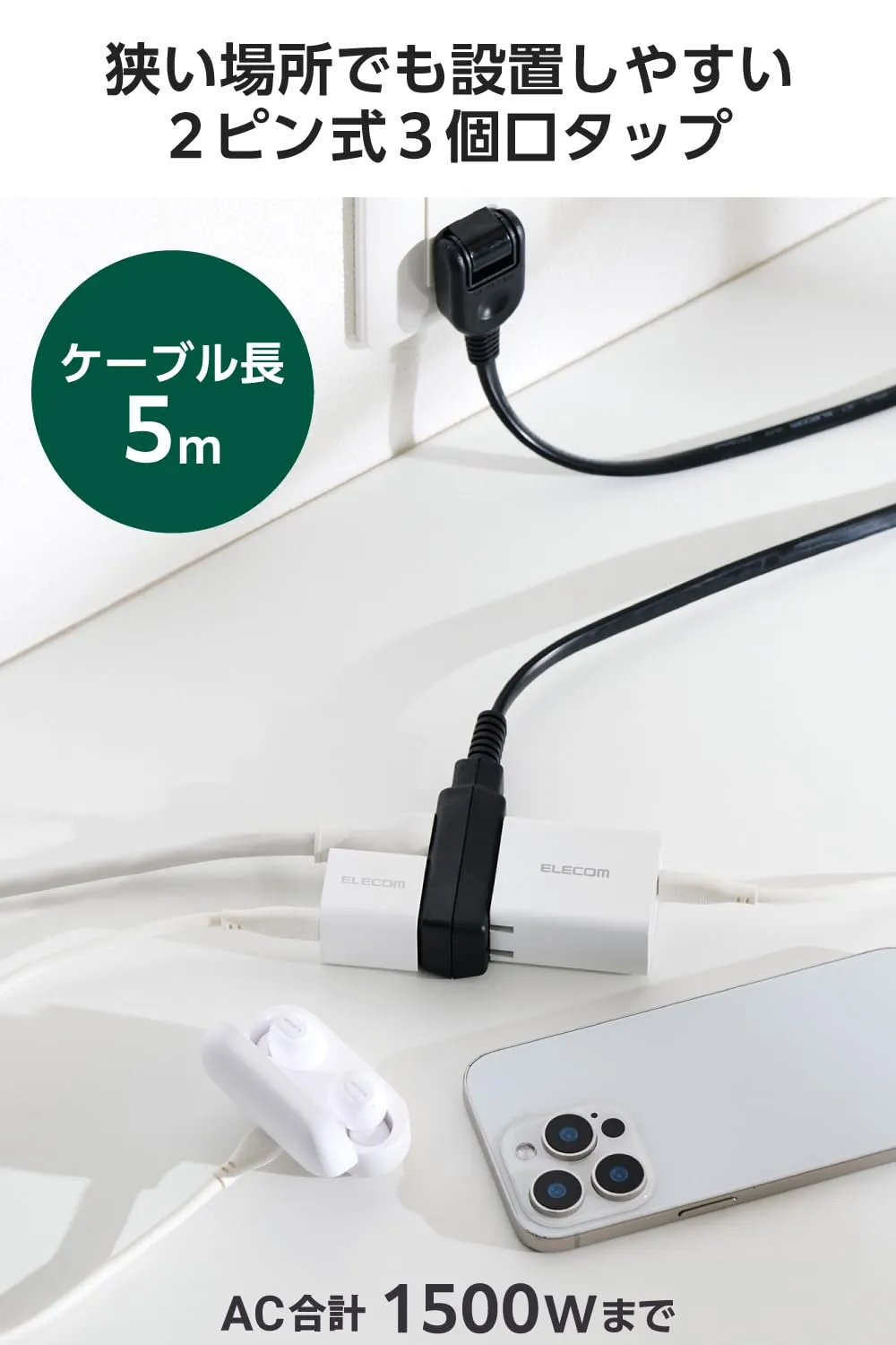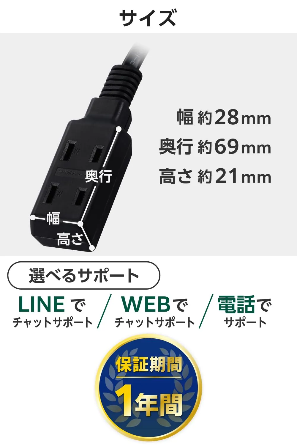 タップ部分がコンパクトで、狭い場所でも設置しやすい3個口タップです。表面に2口、裏面に1口ずつ差込口があります。
