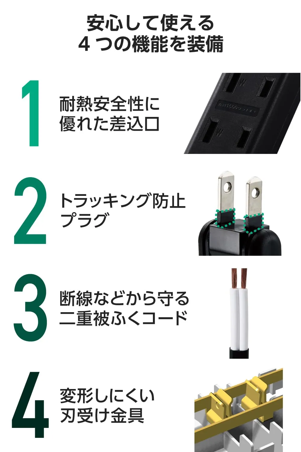 ■タップ本体には耐熱安全性に優れた熱硬化性のユリア樹脂を使用しています。万が一の発熱の際にも融解しにくく、電気火災の防止に有効です。