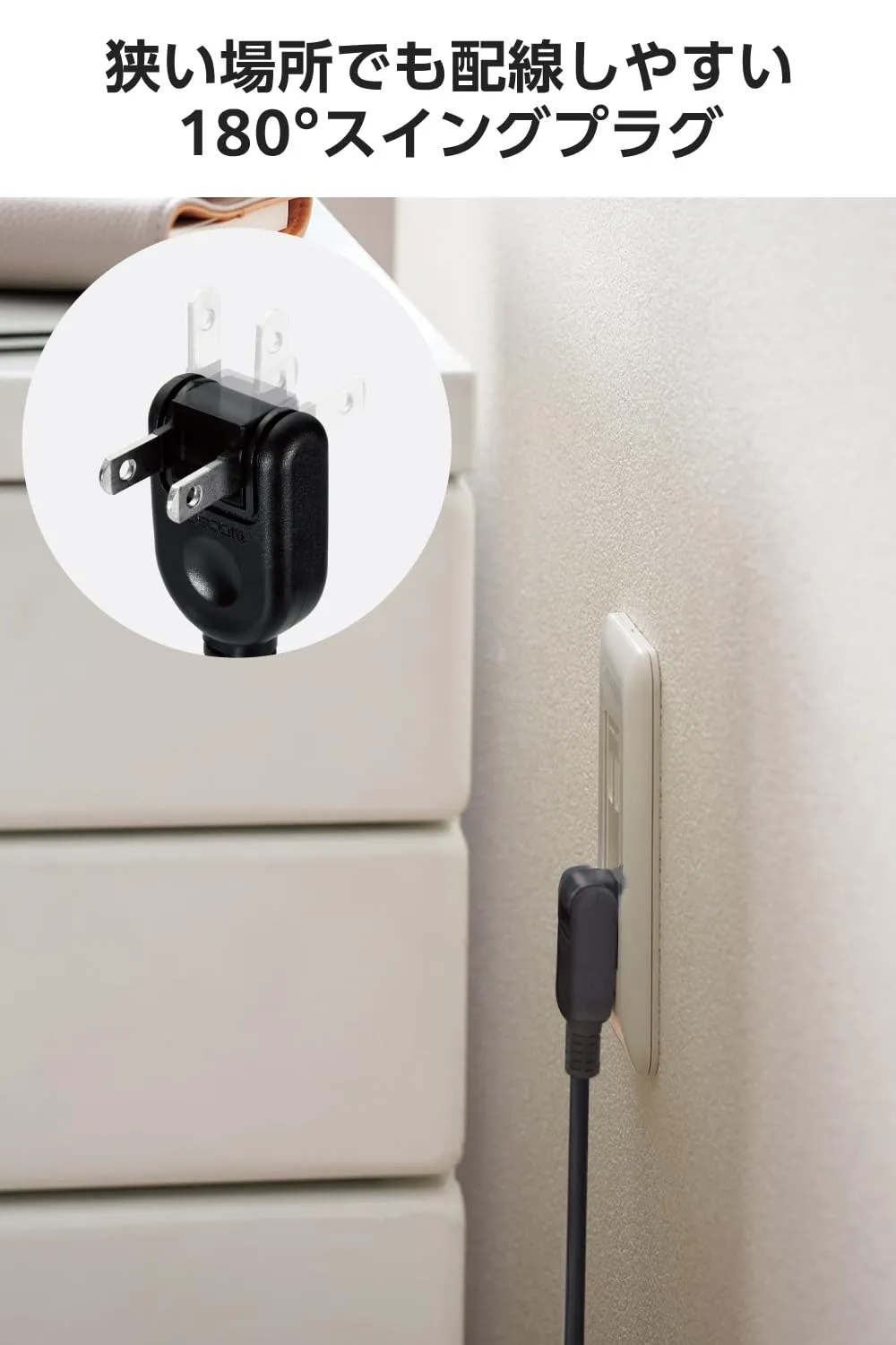 ■狭い場所でも配線しやすく、180度スイング可能な2ピン式プラグを採用しています。