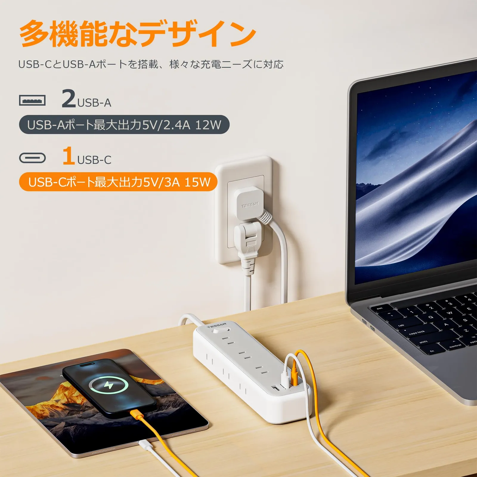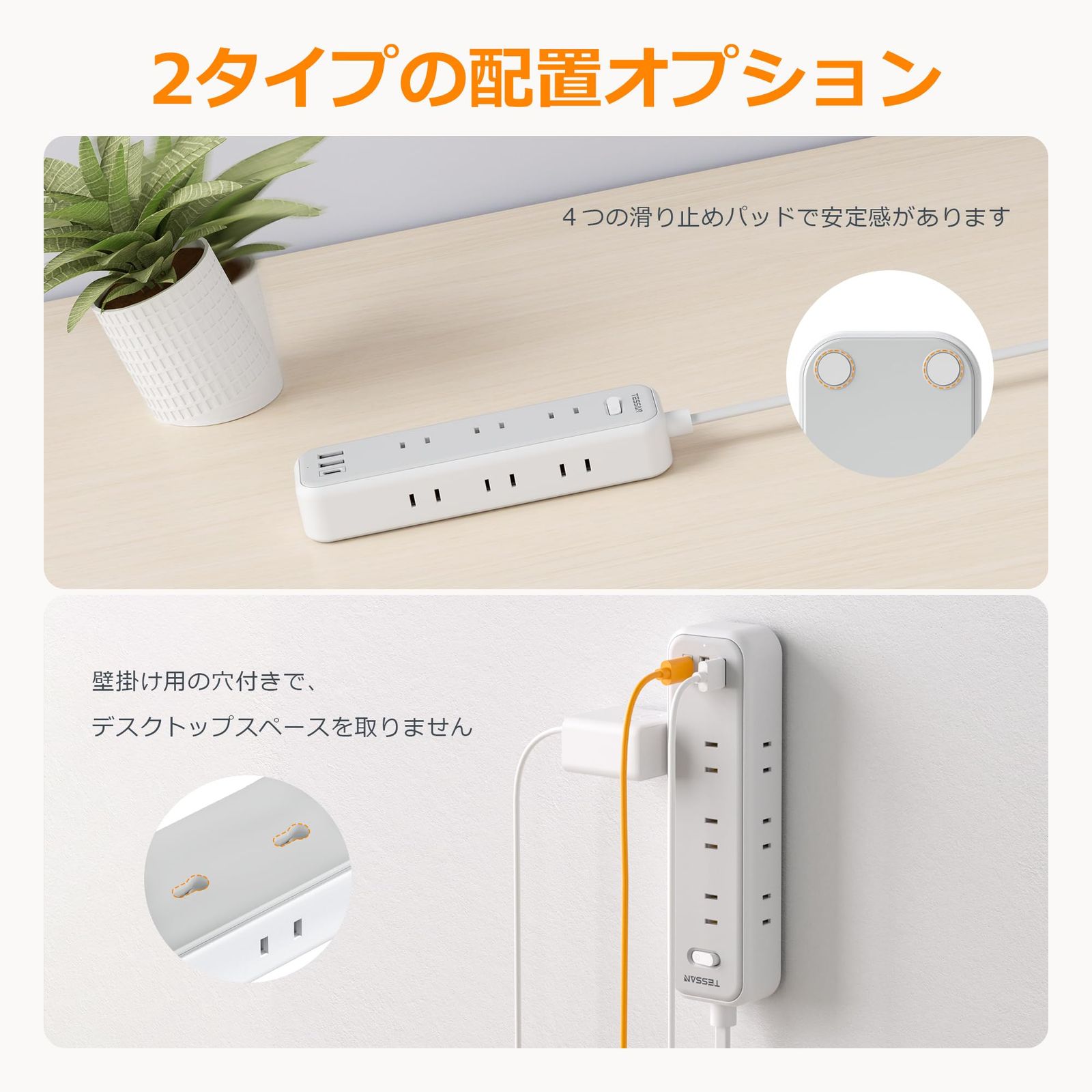 「壁掛け用・卓上に」:コンセントタップは壁等に仮固定できるフック穴付き、壁にかけてご利用できます。省スペースで、配線もスッキリになります。テーブルタップの底の四角にゴム製の滑り止めがついており、卓上で安定感があります。両立な使い方あり、お客様に心地よい生活を与えます。