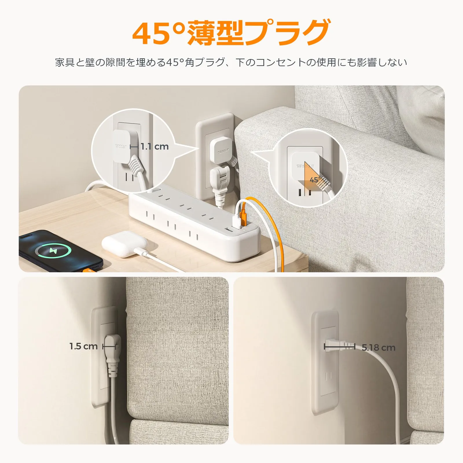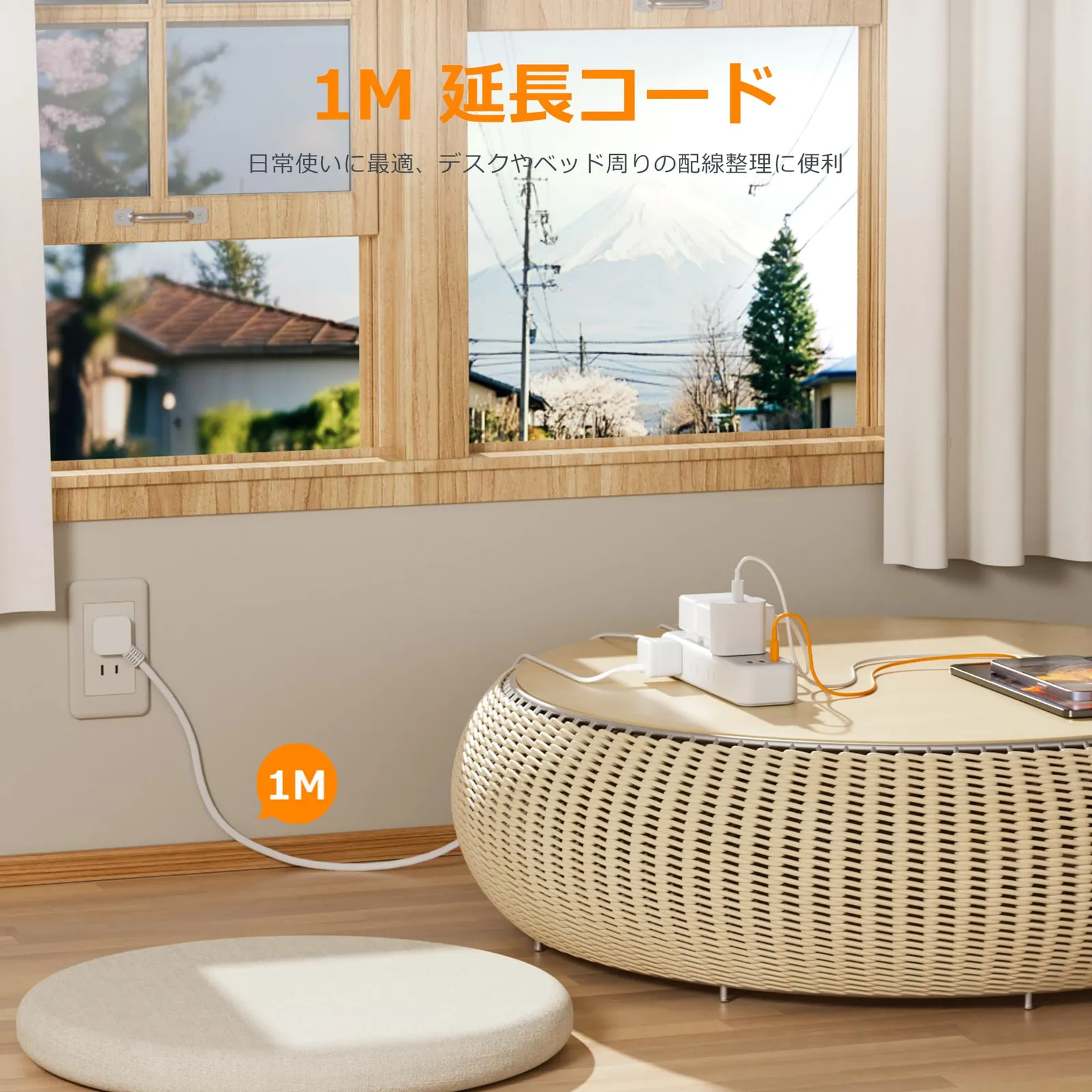 「使用者の便利に配慮」:この延長コードは日本のために研究し、設計されています。45°薄型プラグを採用して、延長コードは狭い隙間にも配線しやすい。使い勝手のいい1mケーブルを採用し、コンセントから少し離れた場所でも利用できます。家庭、オフィス、会議室、パーティーなどにも大活用できます。