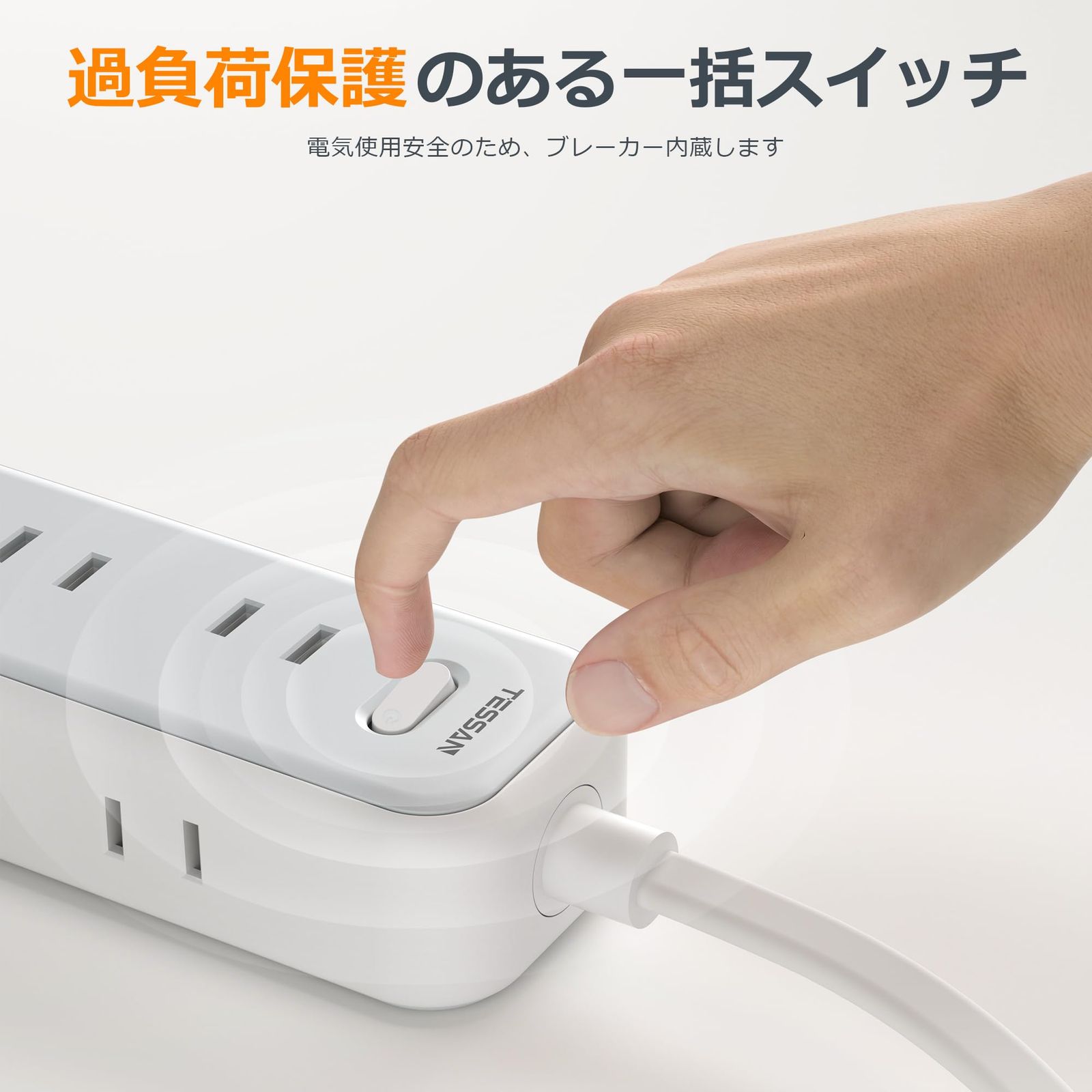 「安全性ある・タコ足配線」:一括集中スイッチ付きで、接続した機器の電源をまとめてON/OFF可能。ブレーカーを内蔵しており、許容量をオーバーした場合ブレーカーが作動し事故を防止。それに、電源確認ライト付き、通電中かは一目瞭然。