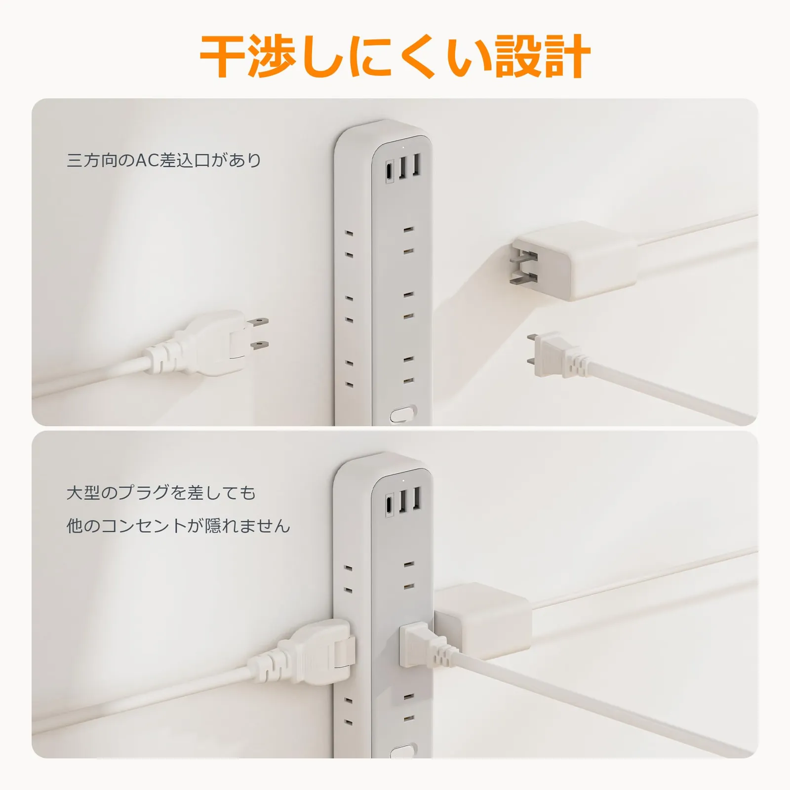 「干渉しづらいデザイン」:ACコンセントを3方向に分配して、どちら側からも気軽にケーブルを挿すことができます。ACアダプタが同時挿せでも互いに干渉せず。AC出力は最大1500W(125V/15A)、ほとんどの家電製品が使用可能!