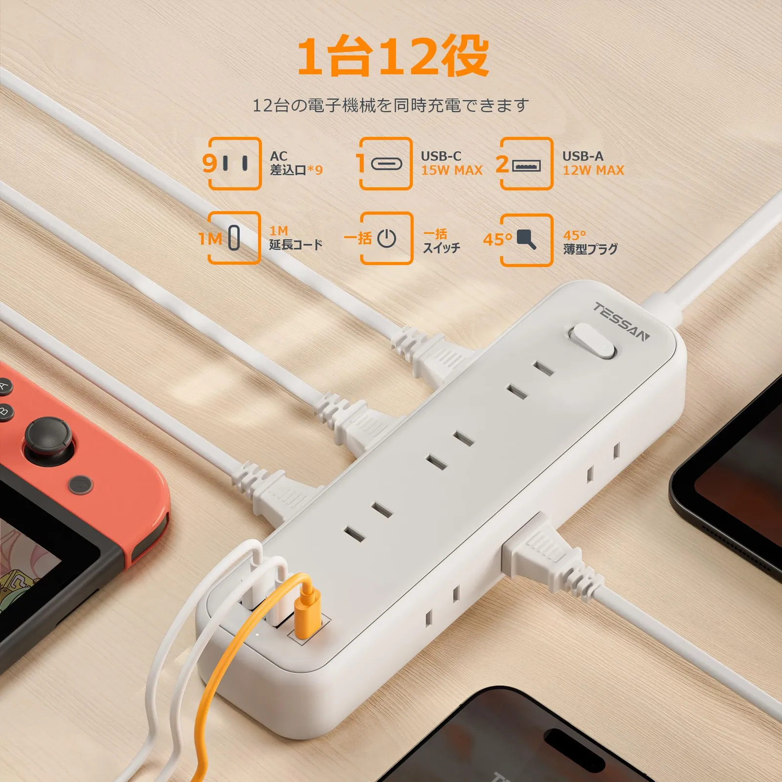 「一台12役・電源タップ」:これはAC差込口9個口とUSBポート3口が一体となったのUSBタップです。まとめて12台の機種が同時に充電で、コンセント不足が解決できます。USB接続機器はデジダル製品の入力電流を自動検知し、最適な電流を送ります。コンパクトな設計の上に機能性もよく 実現します!