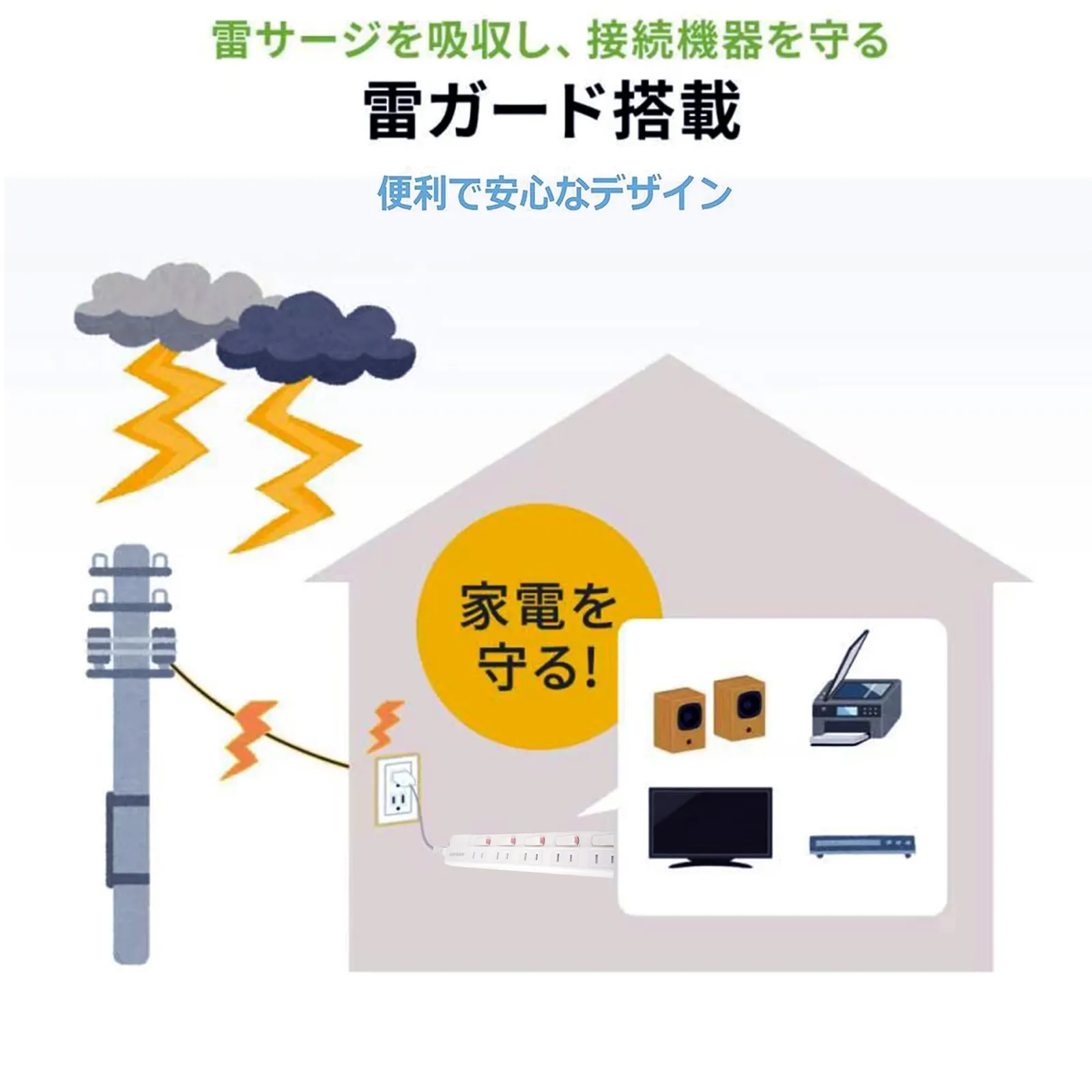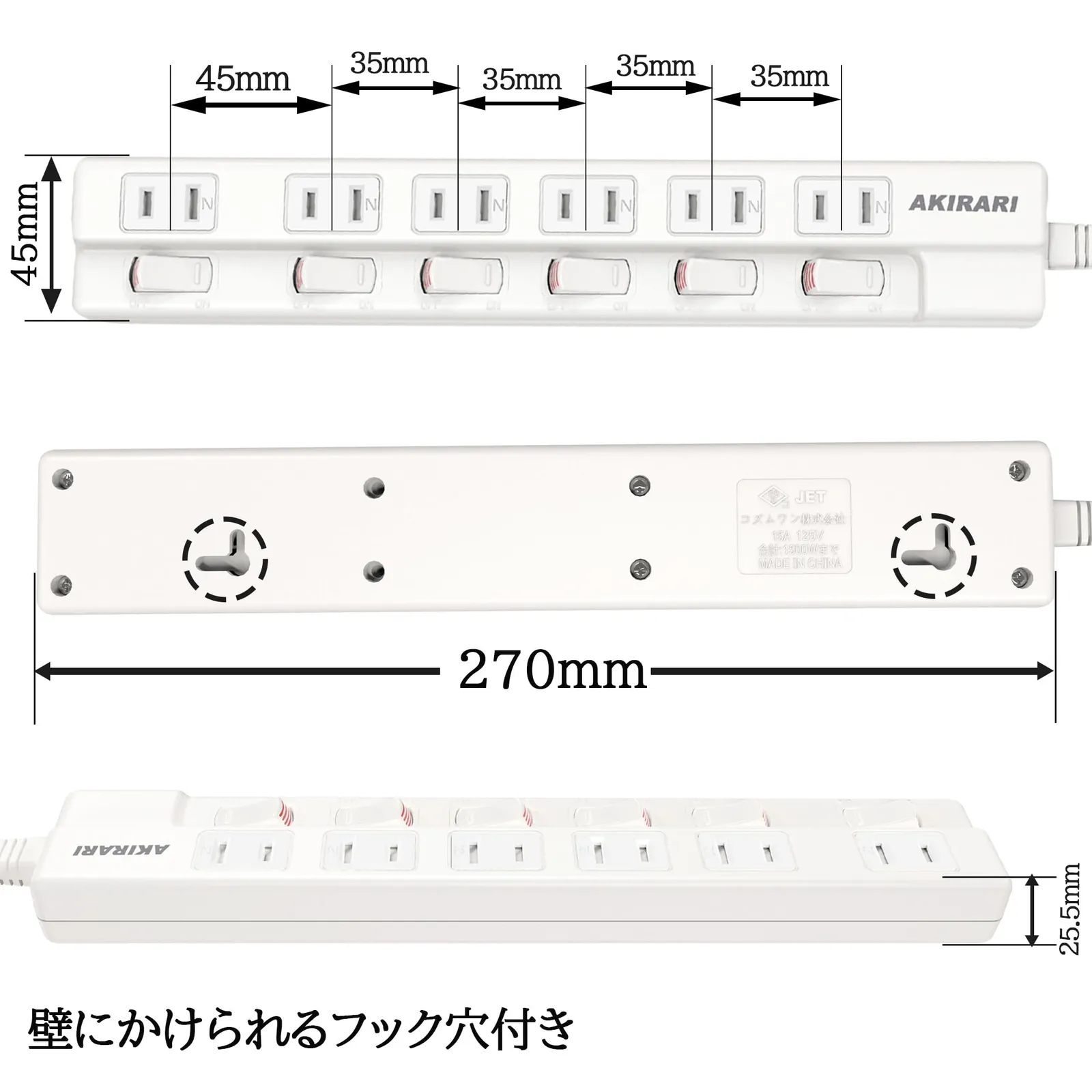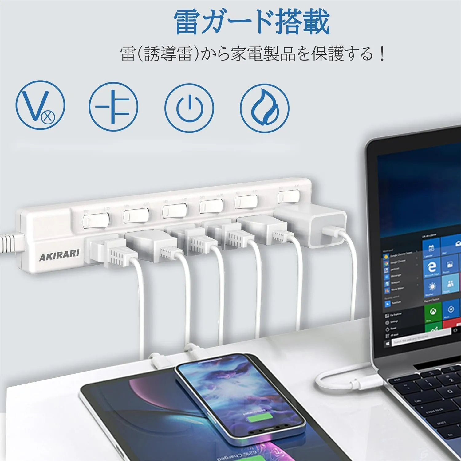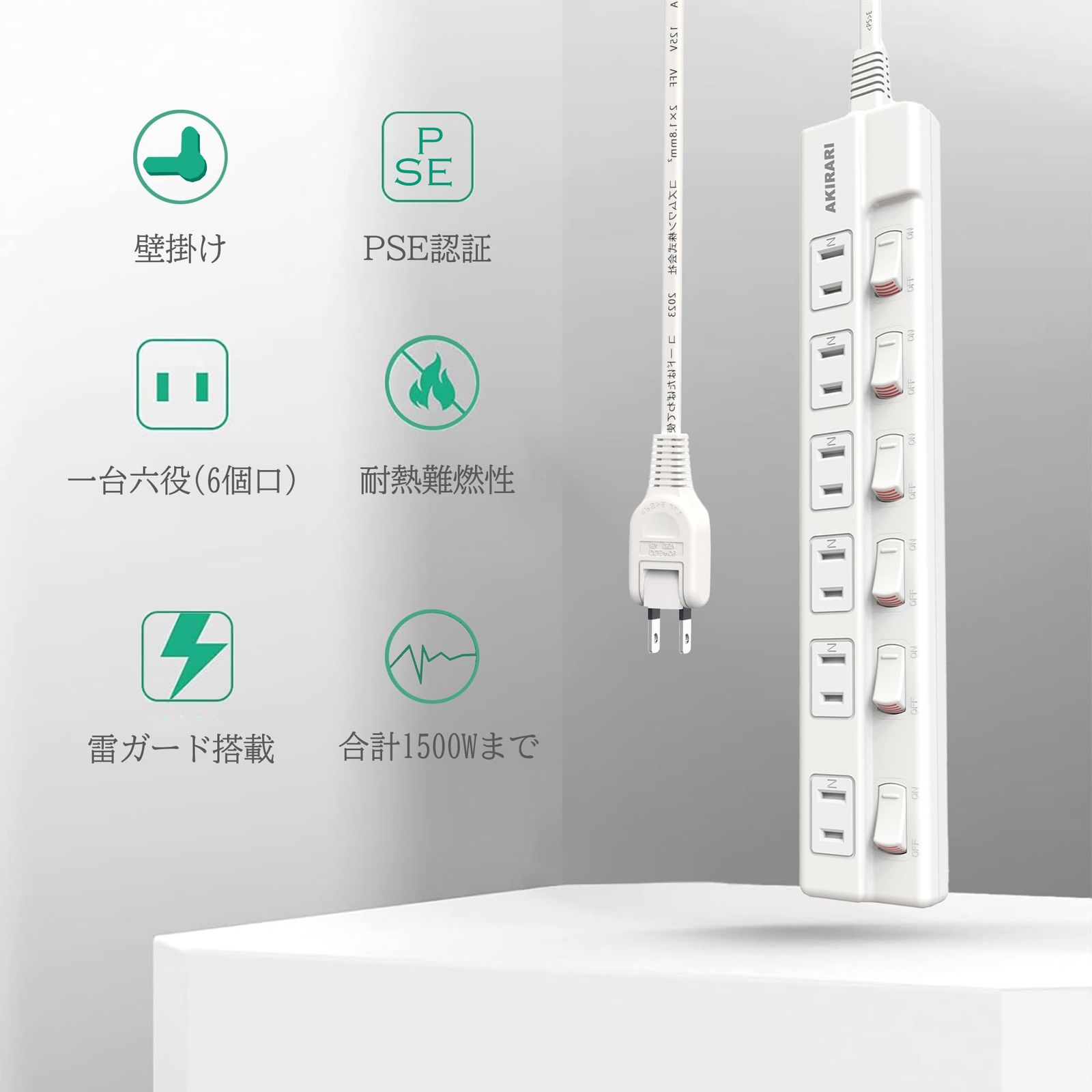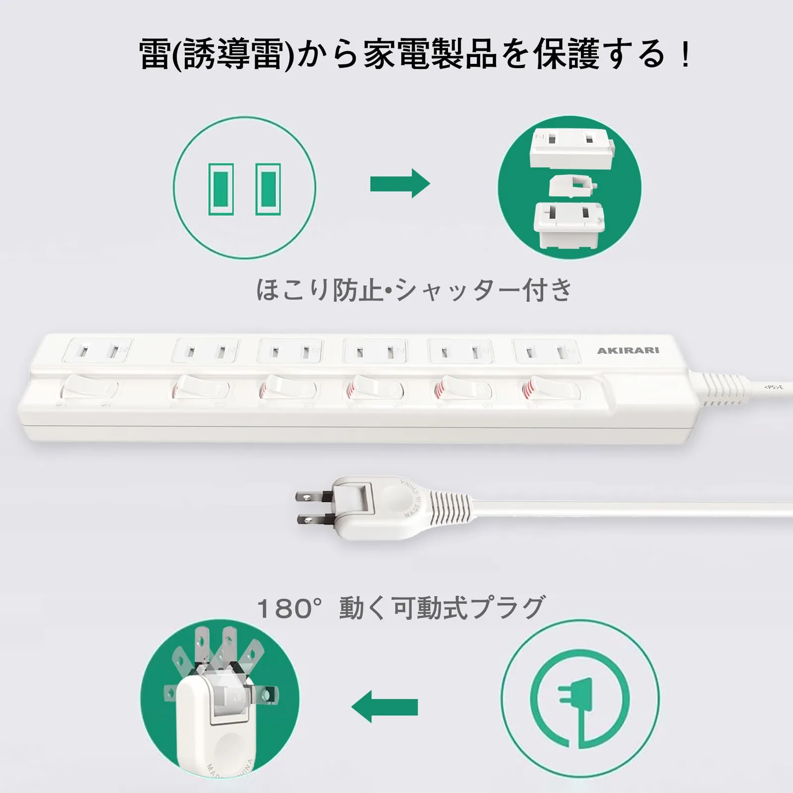 【防塵防雷 個別スイッチ】 電源タップ 6口 2M AKIRARI コンセントタップ ホワイト 雷ガード スイッチ電源タップ テーブルタップ 延長ケーブル 家庭用 6個口 ほこりシャッター付 過電流 過熱保護 すき間 180度スイングプラグ トラッキング防止 節電 省エネ 延長コード おしゃれ 電源 壁 卓上 薄型 コンパクト (2M)