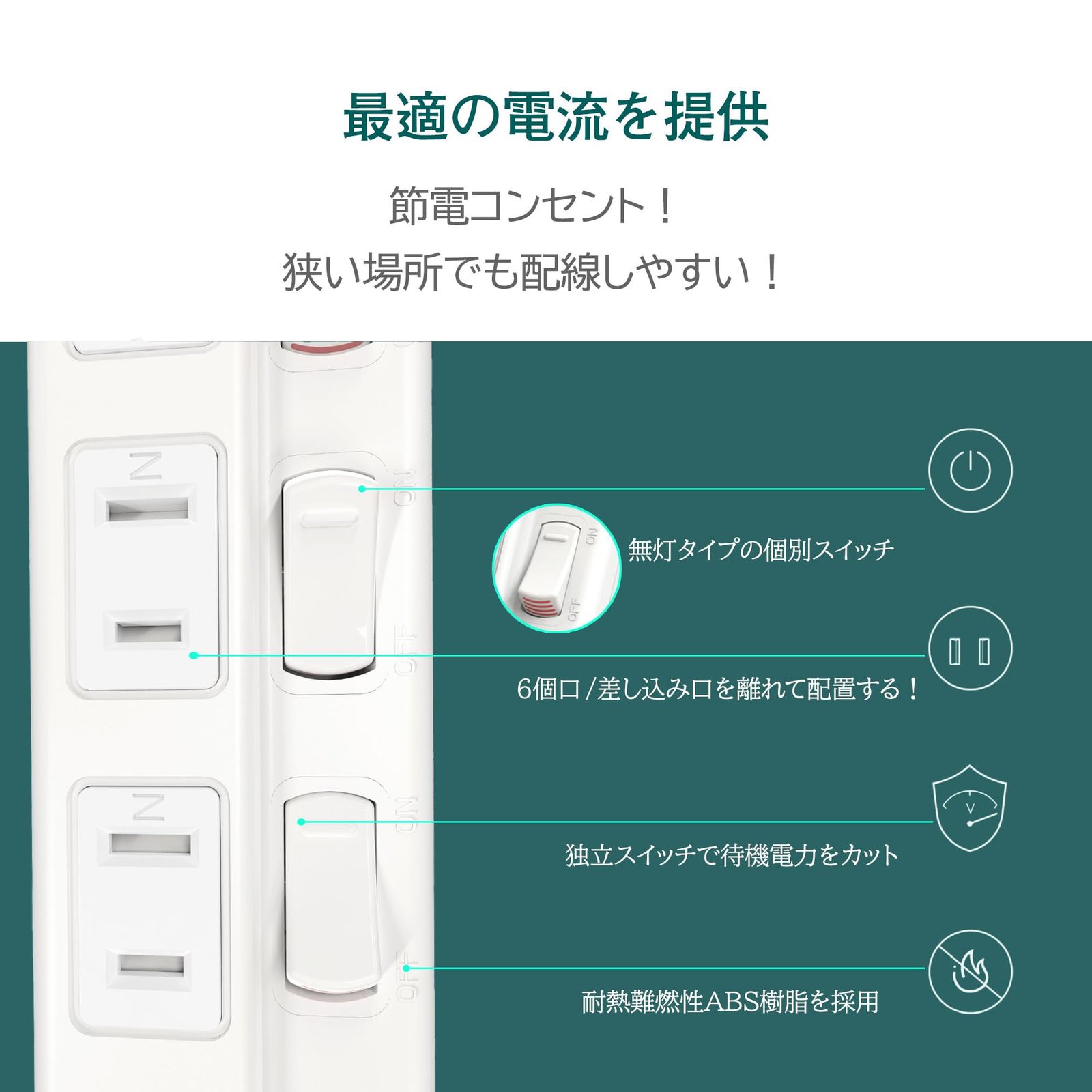 【在庫セール】テーブルタップ 延長ケーブル 家庭用 スイッチ電源タップ 6個口 ほこりシャッター付 雷ガード 過電流 ホワイト 過熱保護 すき間 コンセントタップ 180度スイングプラグ トラッキング防止 AKIRARI 節電 省エネ 2M 延長コード 6口