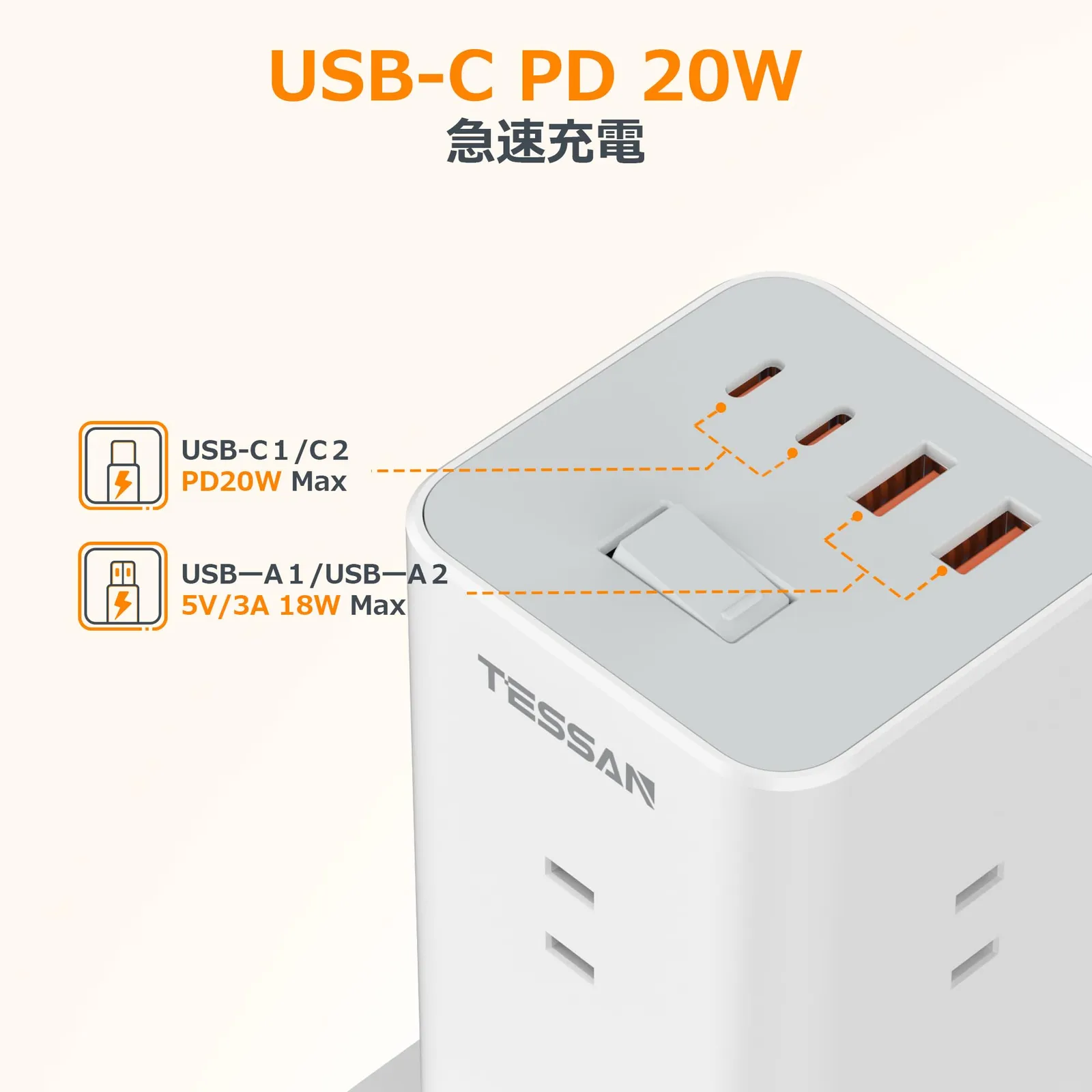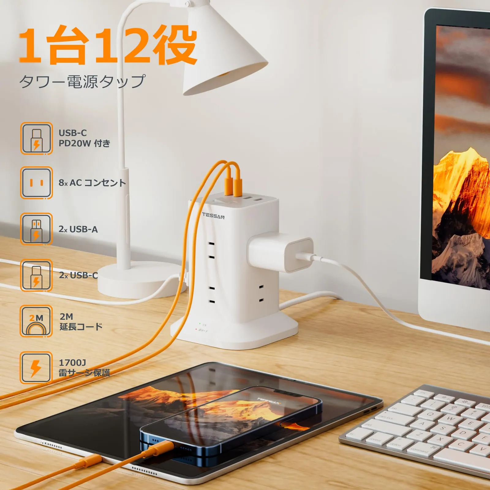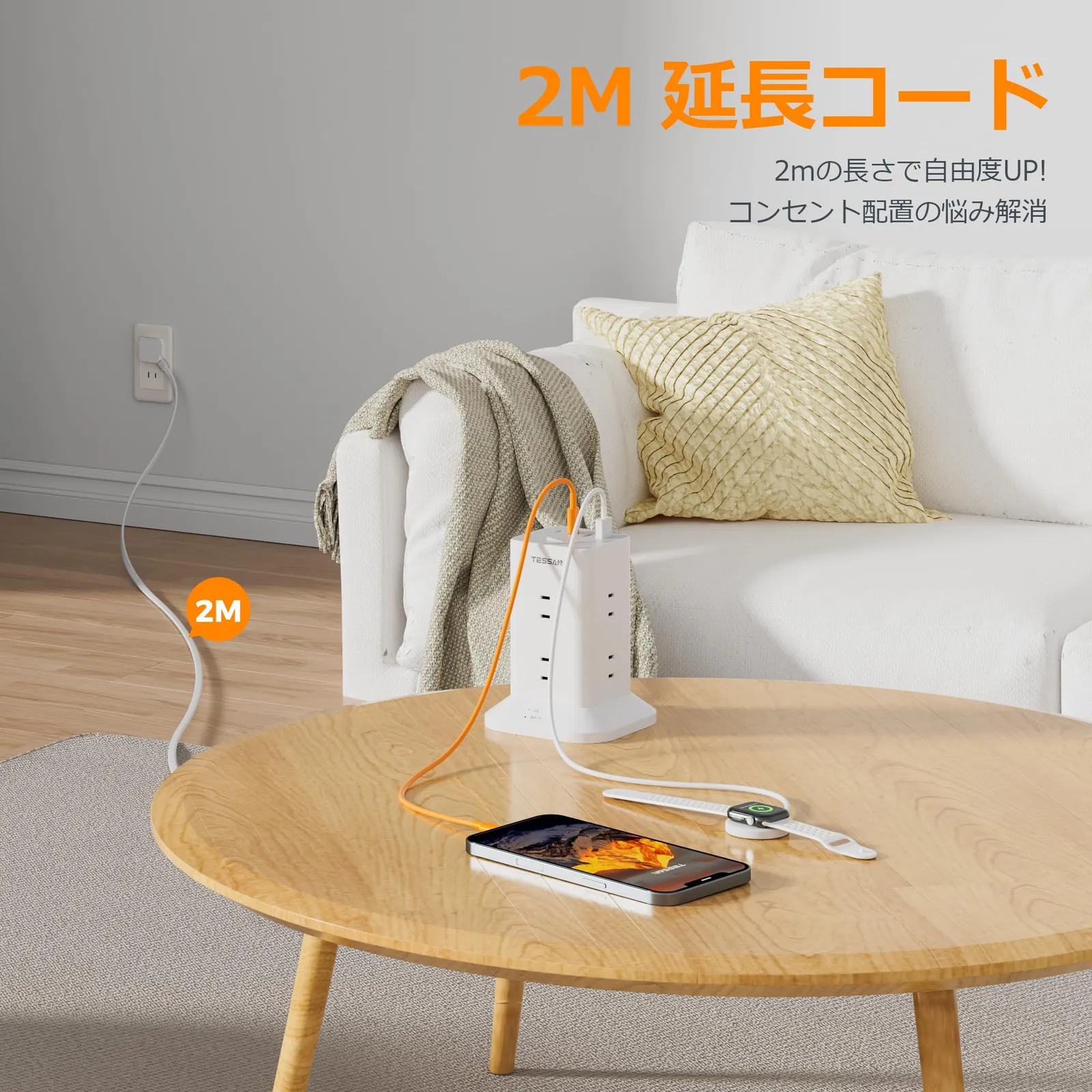 電源タップ タワー型 延長コード 2m 薄型プラグ 8個AC コンセント USBポート4個(Type-A/C) PD20W TESSAN テーブルタップ たこあしコンセント タコ足配線 マルチ OA 雷ガード 一括スイッチ 省エネ mini型 おしゃれ