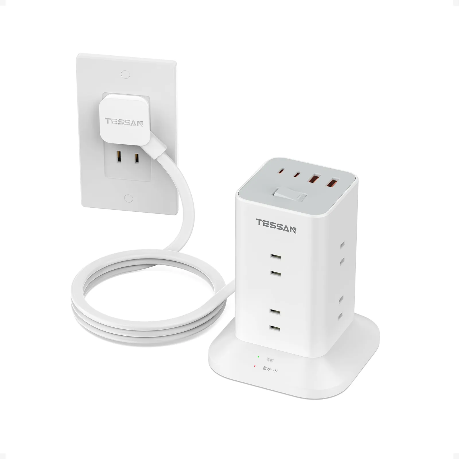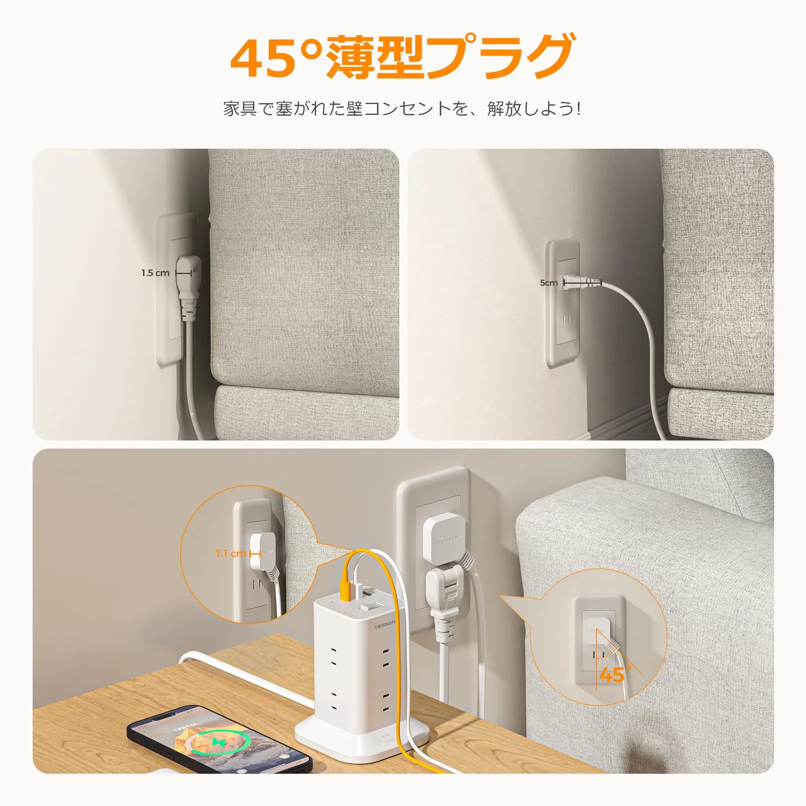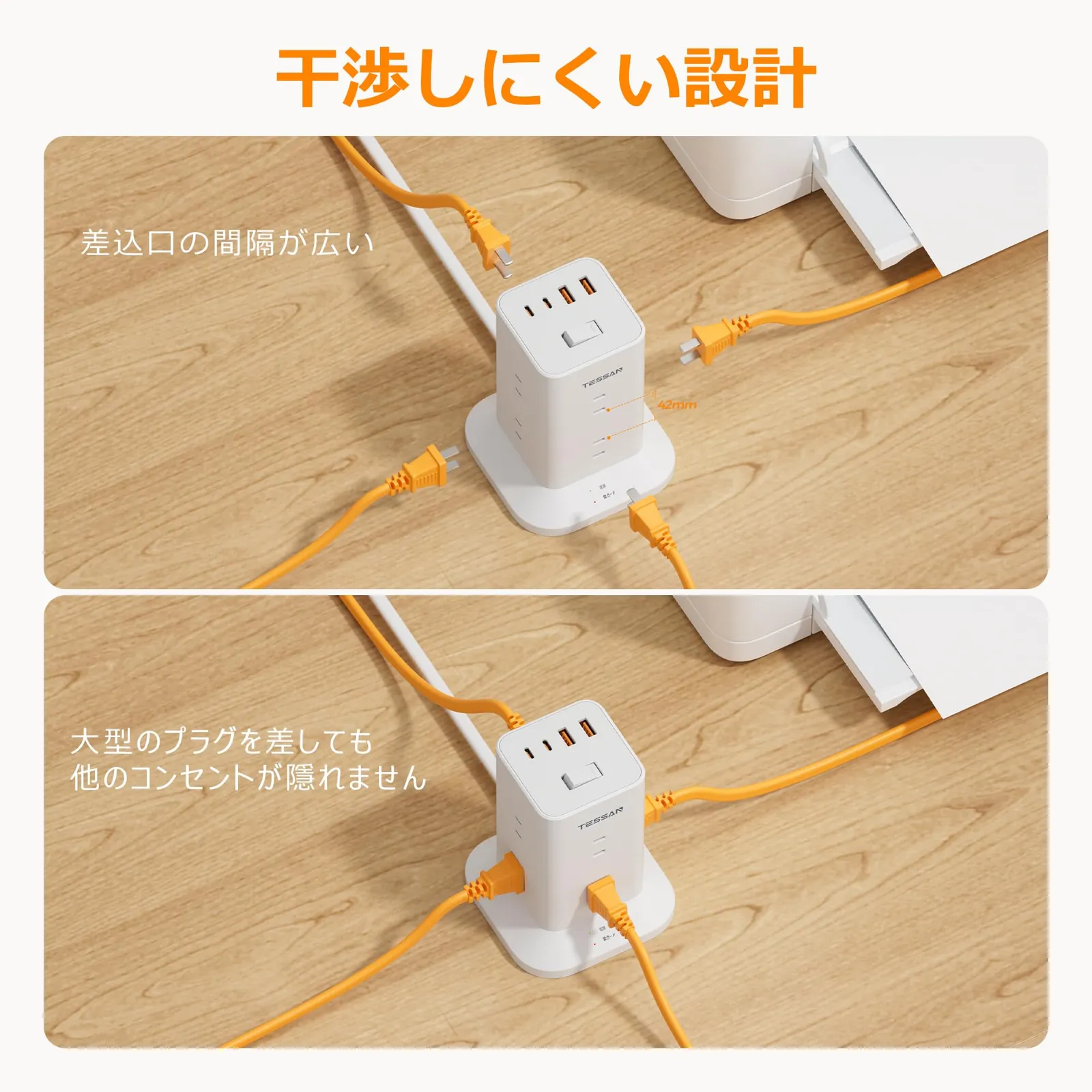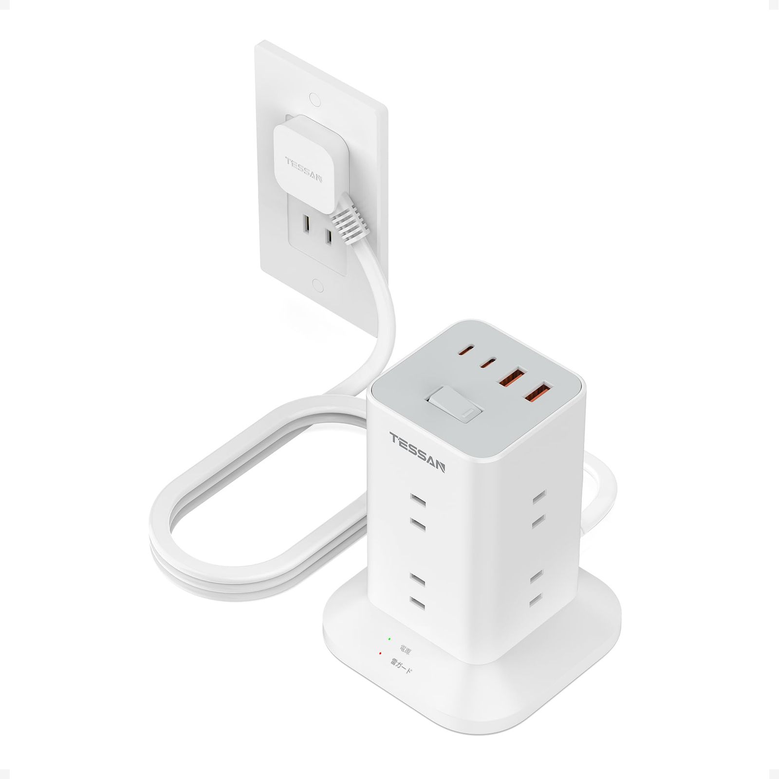 電源タップ タワー型 延長コード 2m 薄型プラグ 8個AC コンセント USBポート4個(Type-A/C) PD20W TESSAN テーブルタップ たこあしコンセント タコ足配線 マルチ OA 雷ガード 一括スイッチ 省エネ mini型 おしゃれ