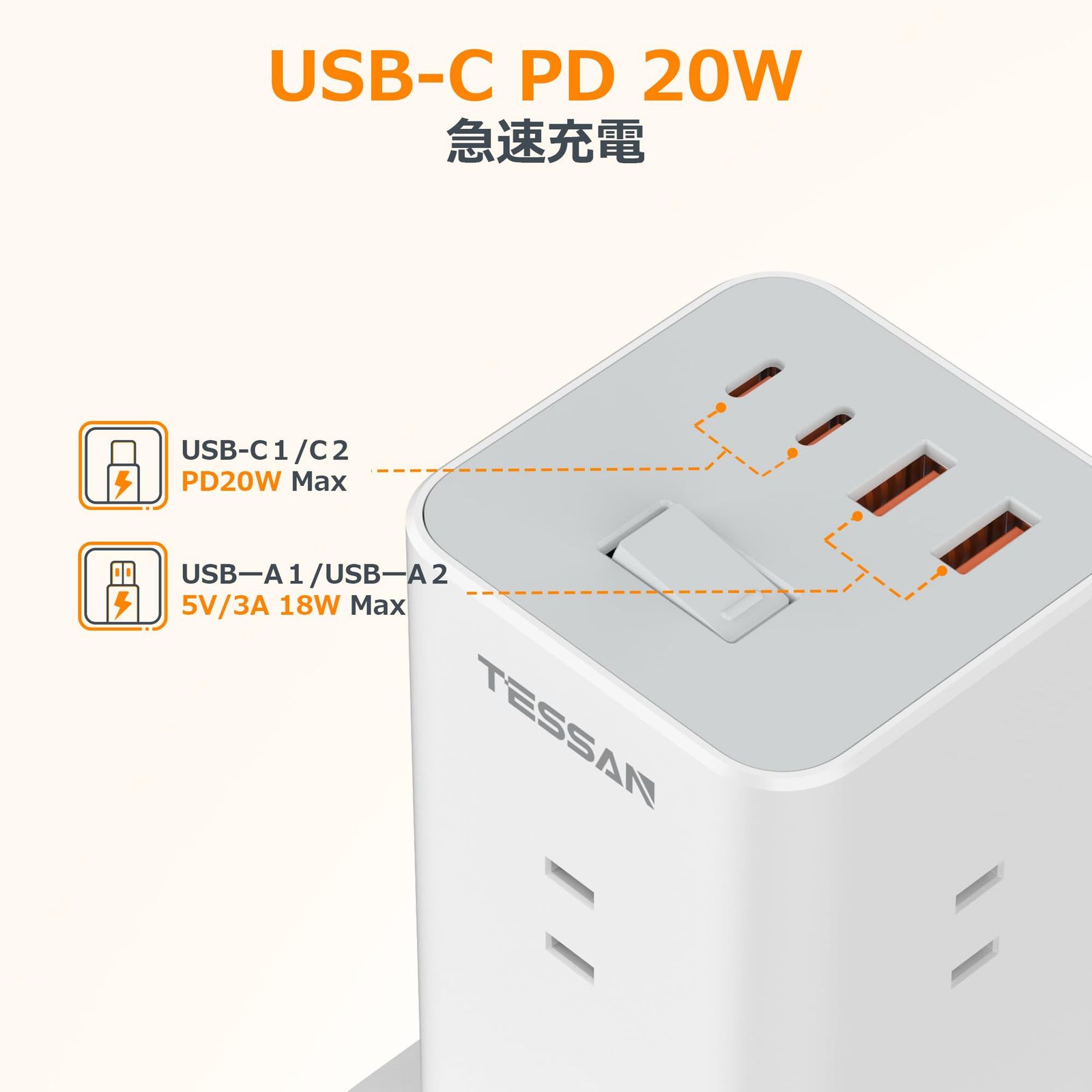 【12役のタワー型電源タップ】8個の広間隔ACコンセントに加え、最大の特徴は2つのUSB-Cと2つのUSB-A、合計4ポートのUSB充電機能です。単口使用時、USB-Cポートは最大20W、USB-Aポートは最大18Wでの高速充電が可能。 全USBポートにスマートICを搭載し、接続する機器に応じて最適な電流を自動分配。複数のデバイスを同時に効率よく充電できます。