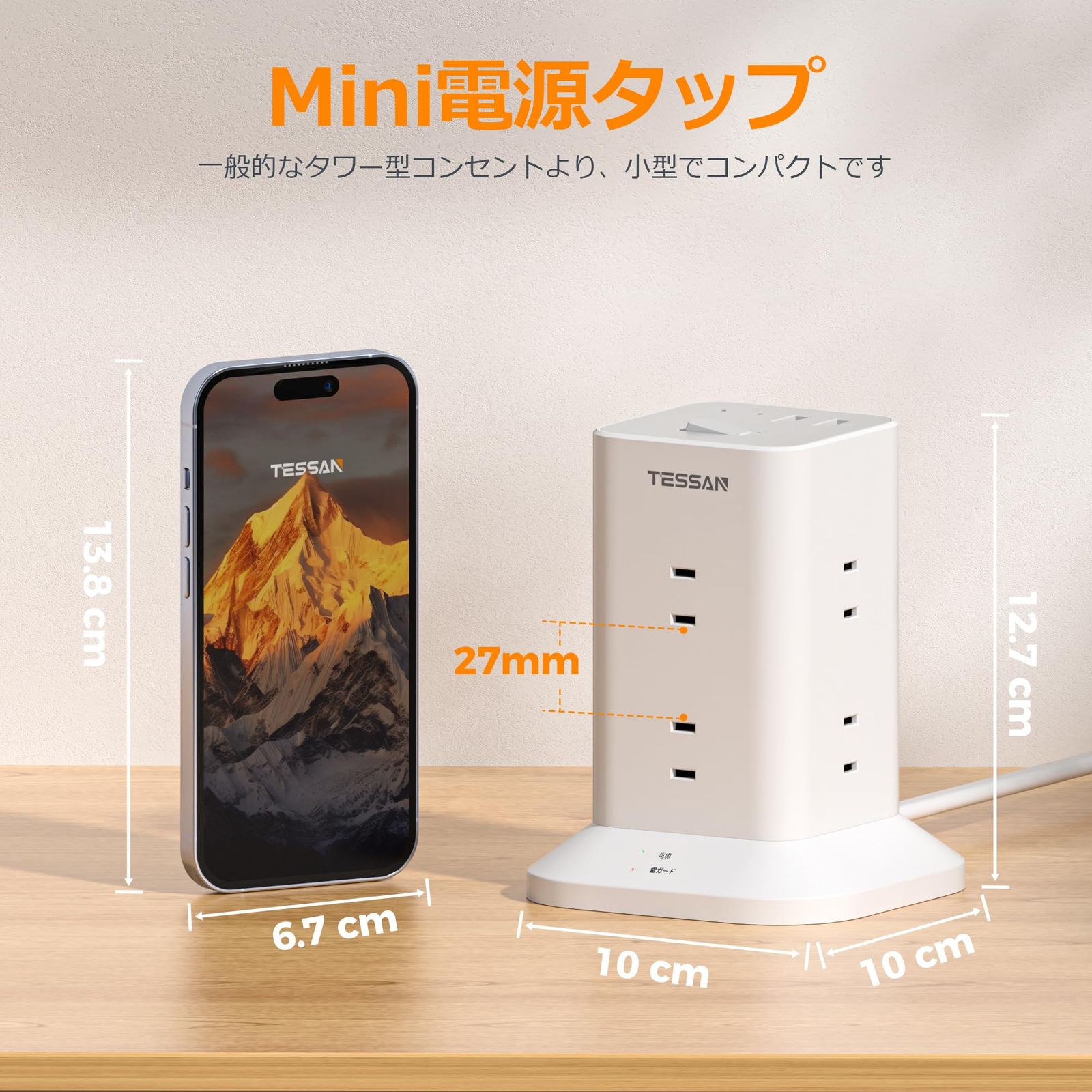 【おしゃれな電源タップ】このmini型電源タップは日本のために研究し、設計されていて、一般的なタワー型コンセントより小型でコンパクトです(本体サイズ:僅か10x10x12.7cm)。在宅勤務、オフィス、会議室、学校、寮、パーティーなど様々な使用場所で活用できます。