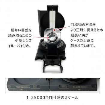 オイルのカプセルを改良し、気密性、耐水性優れた構造にしたコンパスです。方位角には目盛盤に一般的な角度の度数目盛と、 ミル目盛の二種類の表示があり、細かい目盛を読み取るための小型レンズ(ルーペ)が付いています。目標物の方角をより正確に捉えるための「のぞき窓」としての 細長い溝がケースの上蓋に刻まれており、地盤の傾斜を測定する傾斜計もついています。