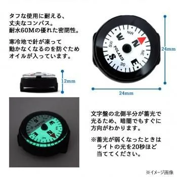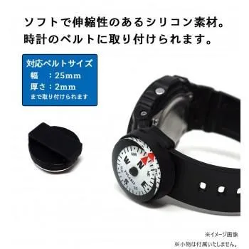 時計のベルトに装着して持ち歩ける、 ミニサイズのコンパスです。寒冷地でも、針が凍ることなく使用できる オイル入りの丈夫な作り。完全防水で、耐水60mの優れた密閉性。文字盤の北側半分が蓄光で光るため、 暗闇でもすぐに方向がわかります。
