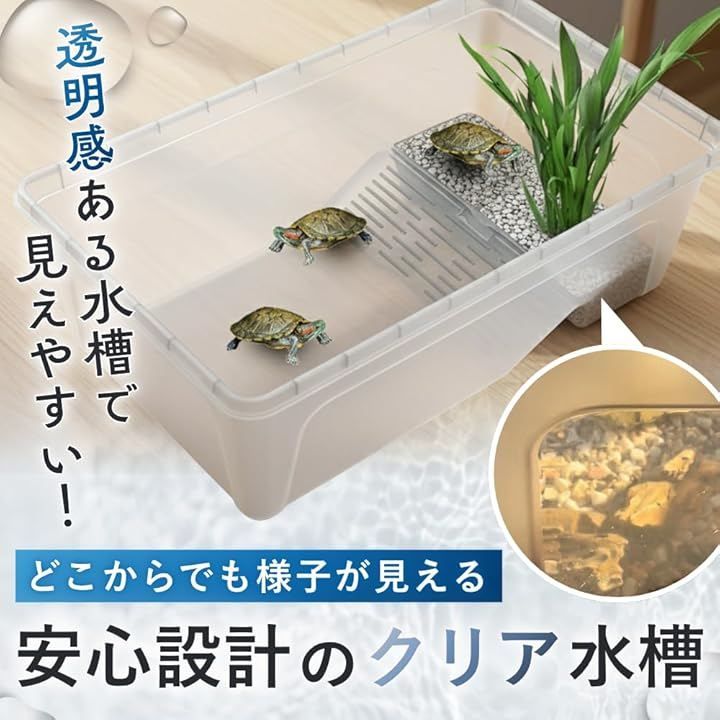 「飼育や観察がしやすい」360度の視野を確保した半透明なデザインで、亀の動きや仕草を細部まで楽しめます。