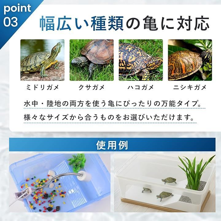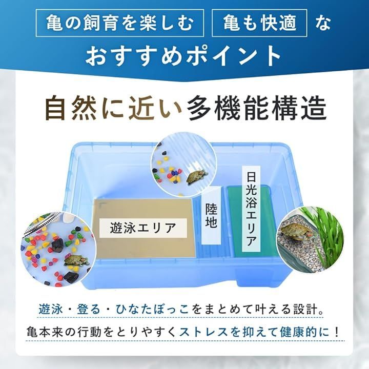 「快適な環境を提供」亀がリラックスできる広いスペースと風景エリアが組み合わさった、水槽の中でのストレスを軽減するデザインです。