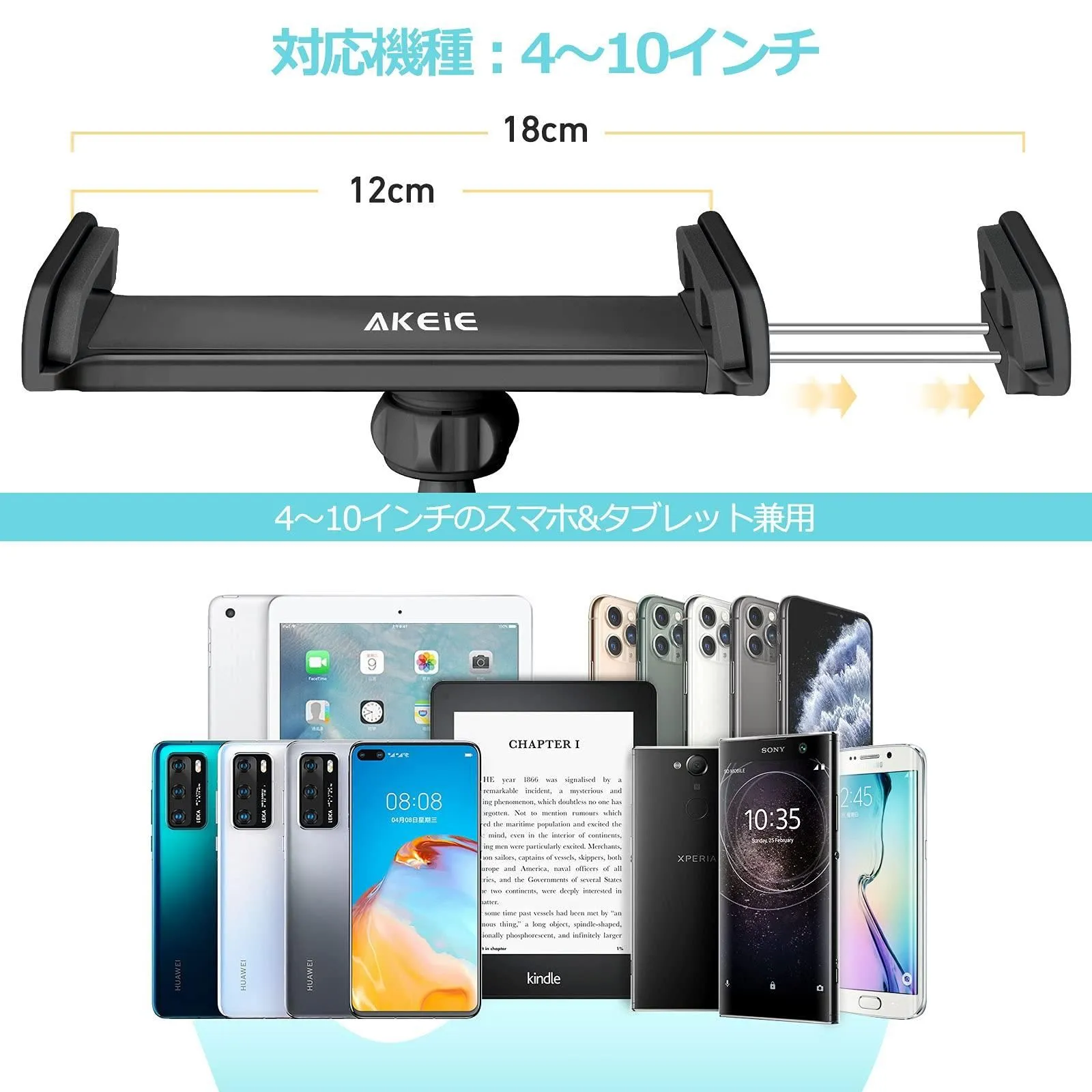 【多機種対応】本製品は幅12-18cm「4-10インチ」のスマホ、タブレット、Switchなどに適応。 充電ケーブルとイヤホンを通せる優しいデザインで、動画見ながら充電と音楽たのしむのがすごく便利です。 対応機種の例:Ipad, Ipad mini,Iphone 5/6/7, ipad air, ipad air2, REGZA Xperia Galaxy ARROWS tab, SONY ELUGA Live Kindle