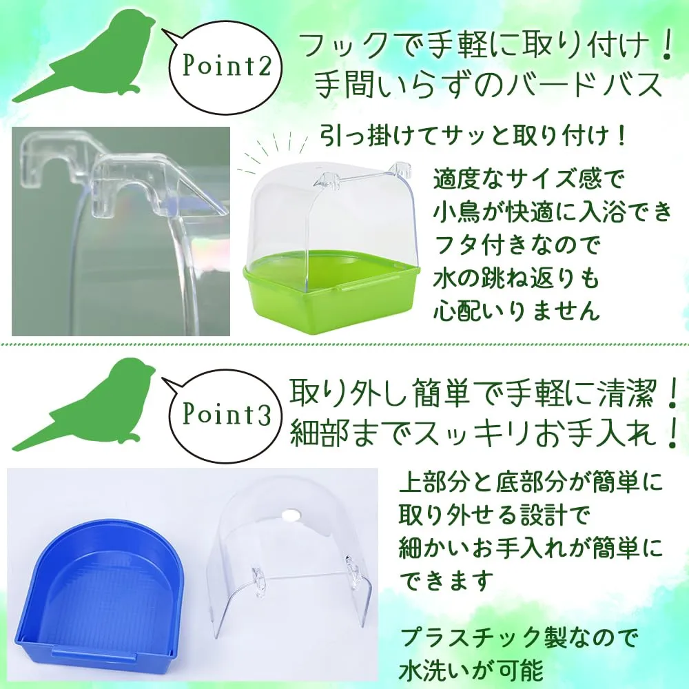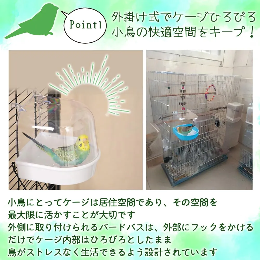 【健康維持】羽根に積もるホコリや寄生虫を除去し、健康維持に欠かせない水浴び。当社のケージ設置型水浴び用容器は、小鳥が心地良く浴びられる設計。お手入れ簡単で、鳥たちの綺麗な羽根を保つお手伝いをします。