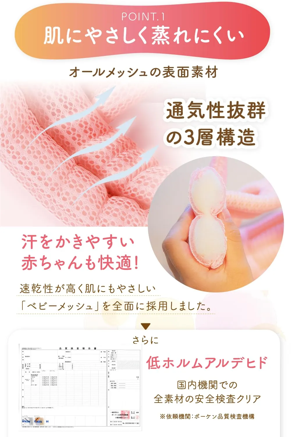 【快適に使うコツは?】コロバンビは通気性の高いメッシュ素材を使っていますが、赤ちゃんのお肌はとってもデリケート。1?2時間おきに汗をかいていないかチェック&軽く拭き取ってあげることで、より快適にご使用いただけます。