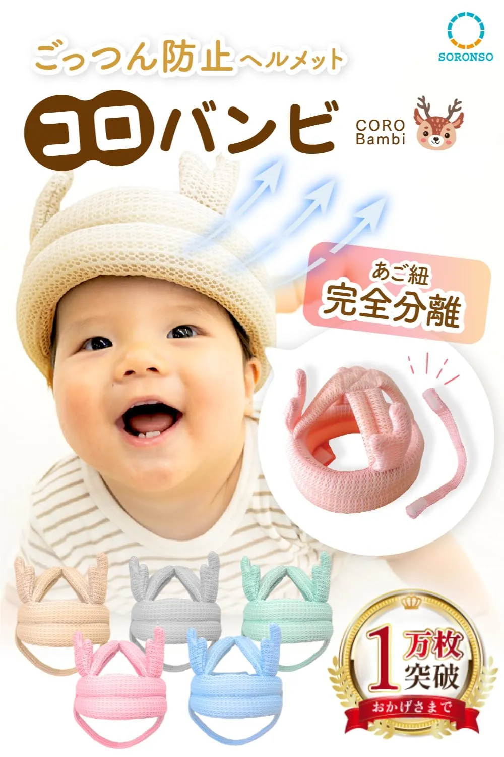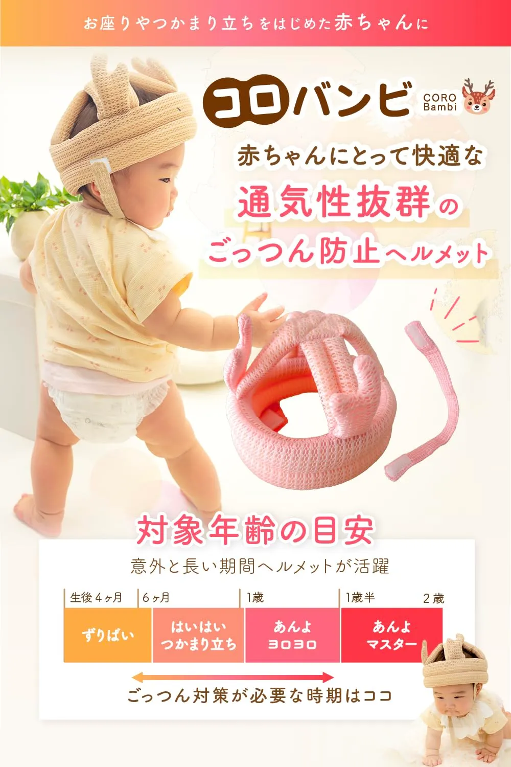 【“ドキッ”を減らしたいママ・パパへ】 ちょっと目を離した瞬間の「ごっつん…!」に悩んでいませんか?かわいい我が子の成長は嬉しい反面、目を離したすきの“ヒヤッ”とする不安を減らしたい…!そんなママパパのために、ベビーヘルメット「コロバンビ」は開発されました。ハイハイ・つかまり立ち・よちよち歩きの時期に頼れるアイテムです。
