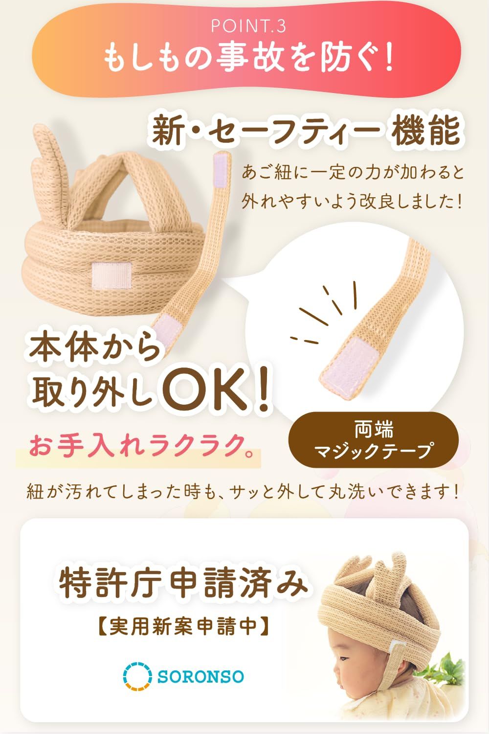 【特許庁申請済み!完全分離のあご紐で安心】 コロバンビは、赤ちゃんの“ごっつん”対策を本気で考えて作った日本発のベビーヘルメット。何度も改良を重ねた特許庁申請済みの新型デザインです。もしもの時も外れやすい「セーフティあご紐」だから、いざという時も安心。国内の安全検査をクリアした「ベビーメッシュ生地」を全面に採用しているので、汗っかきさんも快適です。見た目のかわいさだけでなく、安全性や快適性できちんと根拠があるからこそコロバンビは選ばれています。
