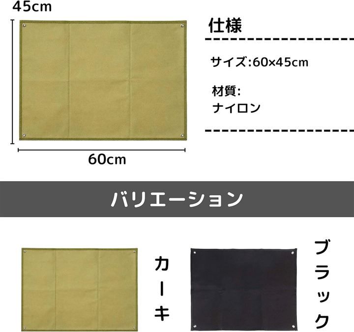 「仕様」サイズ:60x45cm、材質:ナイロン+面ファスナー、カラー:カーキ