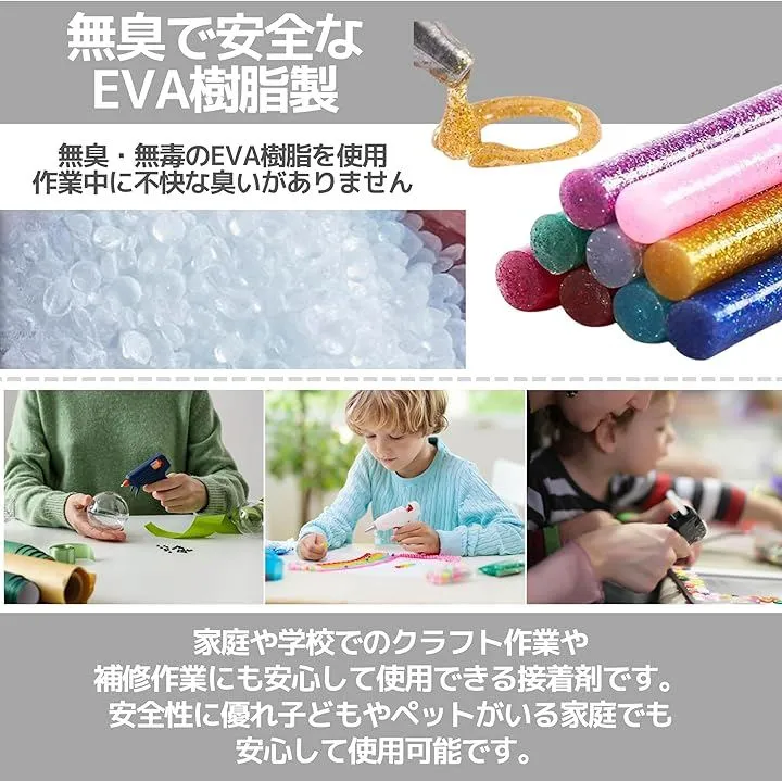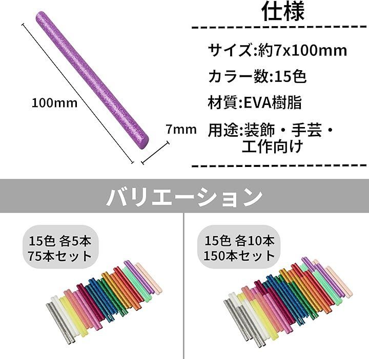 「仕様」サイズ:約7x100mm、材質:EVA樹脂、カラー数/内容:(1)15色 各5本=75本、(2)15色 各10本=150、対応:7mmスティック対応のミニグルーガン、用途:装飾・手芸・工作向け