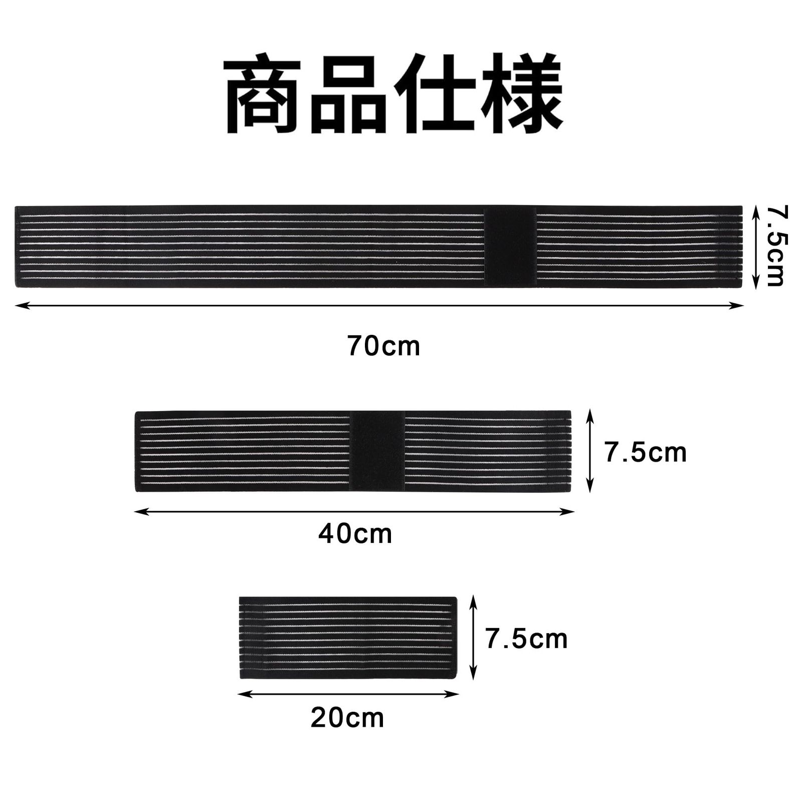 部位に応じて長さを使い分け:20-150cmまでのさまざまな長さがあり、手首やヒジ、足首やヒザ、ふくらはぎ、太ももなど適切なサイズを選んで使い分けることが可能です。