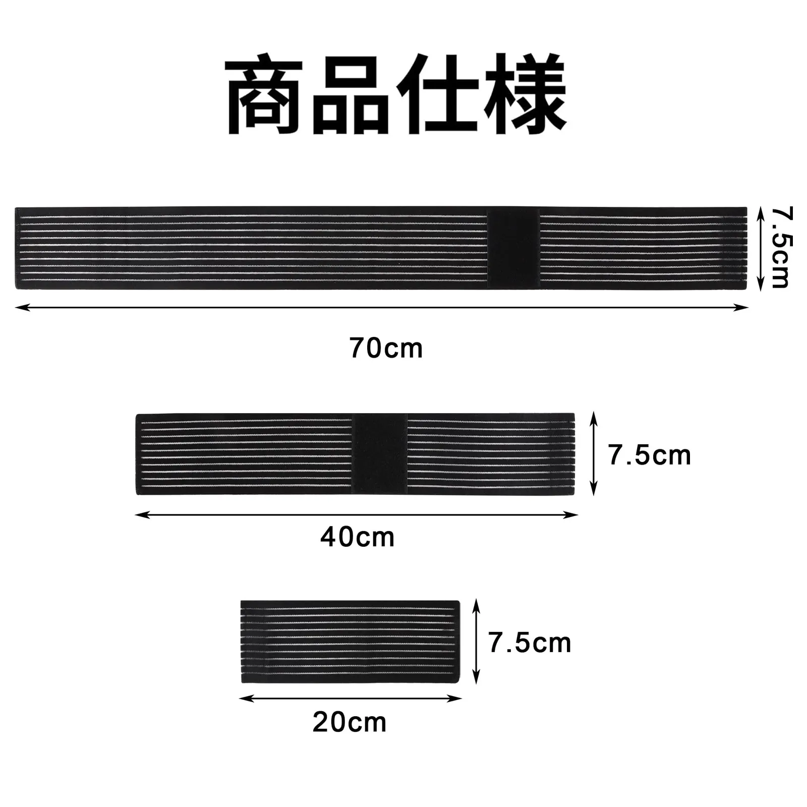 商品仕様:長さ70㎝,幅さ7.5㎝。色:黑色。入れ数:2枚入り。素材:ゴムバンド。