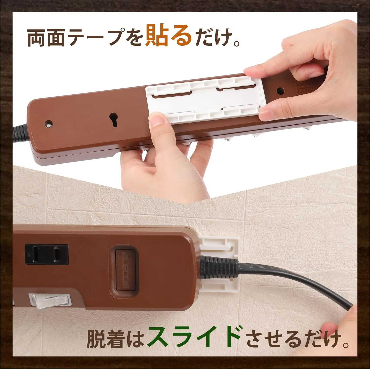 【付属品】:両面テープ ※木ネジは付属しません。※電源タップは付属しません。 スマートフォンやタブレット、PCなど、多くのデバイスを使う現代生活で、電源タップの整理整頓は必須です。そんなときに役立つのが「電源タップ コンセントタップ 固定ホルダー」です。このホルダーは、取り付けが簡単で、どんな場所にもスマートに電源タップを固定できます。両面テープを使うだけで、誰でも簡単に設置可能です。さらに、スライドさせるだけで脱着も簡単なので、必要に応じて場所を変更することもできます。 強力な粘着パッドで安心の固定力 「電源タップ コンセントタップ 固定ホルダー」は、アップグレードされたプレミアムナノゲル製の強力な粘着パッドを使用しています。この粘着パッドは環境に優しく、最大3.6kgの重量を支えることができます。これにより、重い電源タップやコンセントタップもしっかりと固定でき、安心して使用することができます。 どんな場所でも使える汎用性 この固定ホルダーは、滑らかで凹凸のない平らな面であれば、どんな場所にも貼り付け可能です。例えば、デスクや壁、ベースボード、キャビネット、木材の表面などに対応しています。オフィスや部屋、キッチンなど、どこでもスマートに電源タップを固定できるのは、このホルダーならではの特徴です。 多用途に使える省スペースデザイン オフィスや部屋、キッチンでの使用に最適な「電源タップ コンセントタップ 固定ホルダー」は、電源タップやルーター、リモコン、フォトフレーム、壁掛け時計、ペーパータオルボックスなど、さまざまなアイテムを固定できます。省スペース設計により、必要なアイテムを効率的に収納し、すっきりとした空間を維持できます。 ネジ穴付きでさらに固定力アップ 「電源タップ コンセントタップ 固定ホルダー」には、両面テープが効かない場所に対応するためのネジ穴も設けられています。これにより、さらに固定力を高めることができ、どんな場所でも安心して使用できます。ネジは付属していませんが、市販の木ネジを使用することで、しっかりと固定することが可能です。 幅広い使用対象 この固定ホルダーは、コンセント、リモコン、ペーパータオルボックス、ルーター、アダプターなど、固定が必要なさまざまなアイテムに対応しています。キッチン、オフィス、寝室、リビングなど、どの部屋でも簡単にセットでき、快適な生活空間を提供します。 様々な壁材に対応 「電源タップ コンセントタップ 固定ホルダー」は、滑らかなセラミックタイル、木製、ガラス、平らなステンレス鋼、アクリル、プラスチック、ラミネートベースなど、さまざまな壁材に設置可能です。どんな壁でもしっかりと固定できるので、どの家庭でも安心して使用することができます。 最後までご確認頂き誠にありがとうございました。 ご確認頂き、ご購入いただけましたら幸いです。 何かご不明点などがございましたらお気軽にメッセージからお問い合わせ下さい。