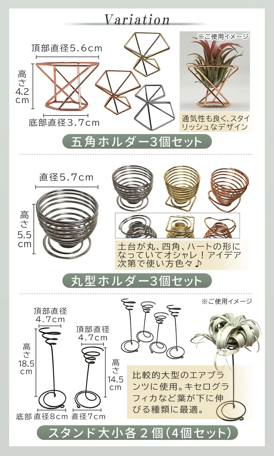 【お好みで選べる、おしゃれなデザイン】五角形、丸型ホルダーはさかさまにしても小さなエアプランツを飾れます。工夫次第で飾り方は無限大!丸型ホルダーは土台が丸、四角、ハートになっており、アイデア次第で色々な使い方ができます。